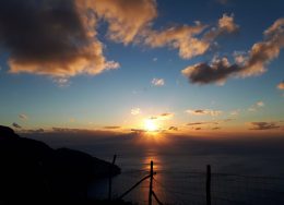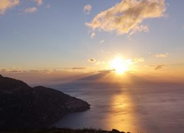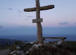 Dopo alcune brevi pause e un’ora di cammino in cui vediamo aumentare gradualmente la luce intorno a noi, arriviamo a Monte Comune alle 7.15. È una distesa pianeggiante, con una vista mozzafiato sul Monte Faito e su Positano e con una croce che si staglia su questo fantastico panorama. Siamo parecchio infreddoliti poiché un vento freddo soffia forte contro di noi e ci mette a dura prova. Dopo aver visto la “croce dei due Golfi”, ci sediamo sull’erba in attesa che sorga il sole alle 7.27; alcune nubi, tuttavia, prolungano la nostra attesa, oscurando il sole.