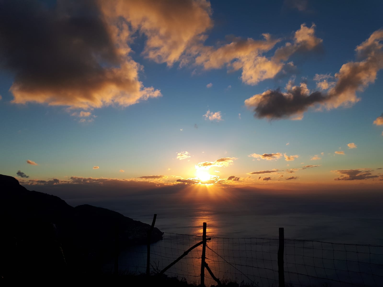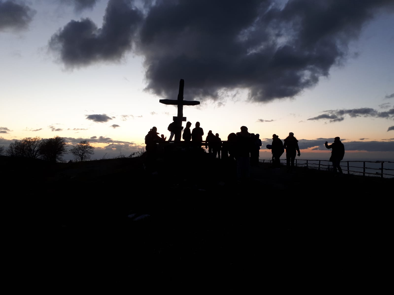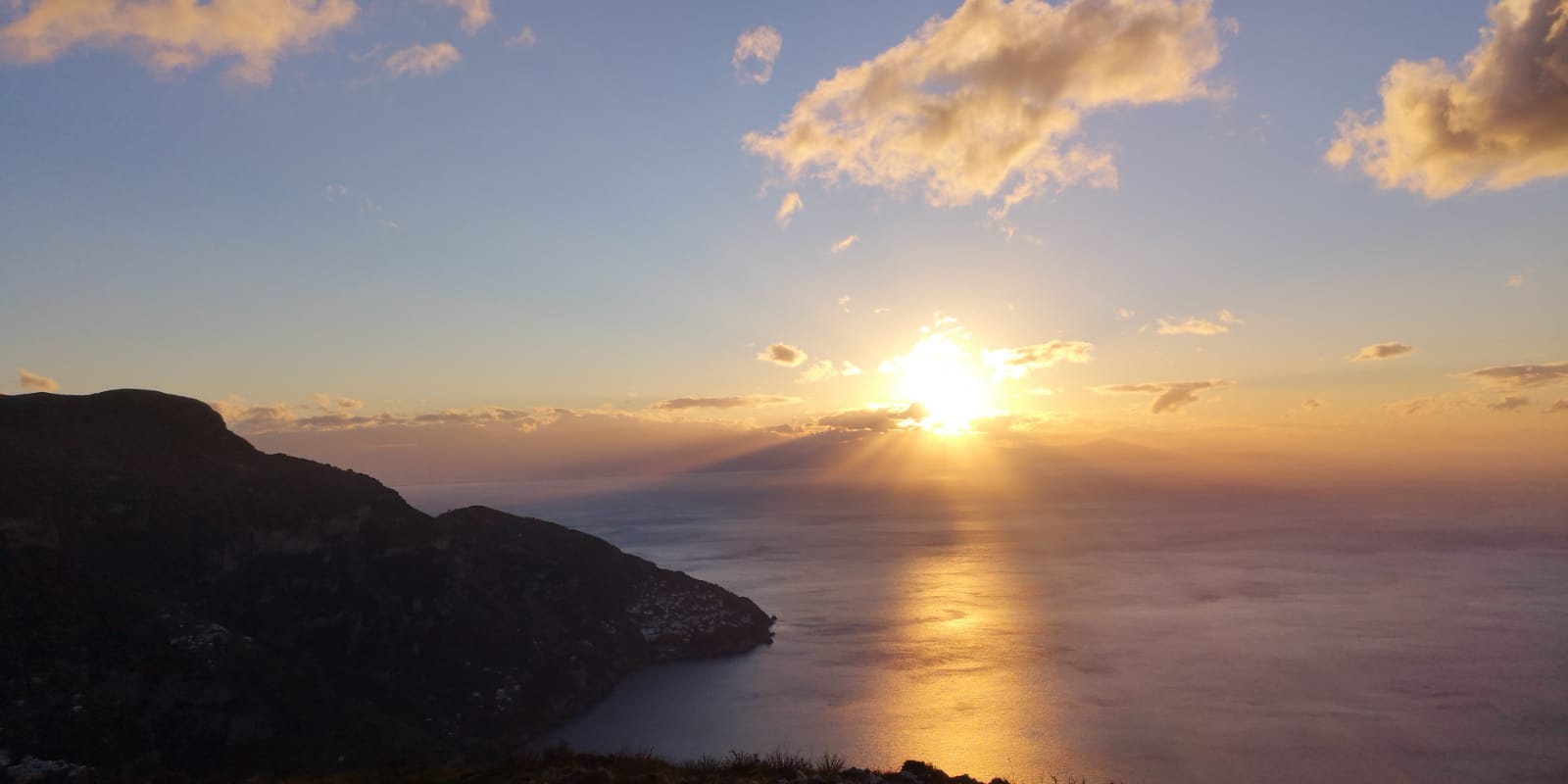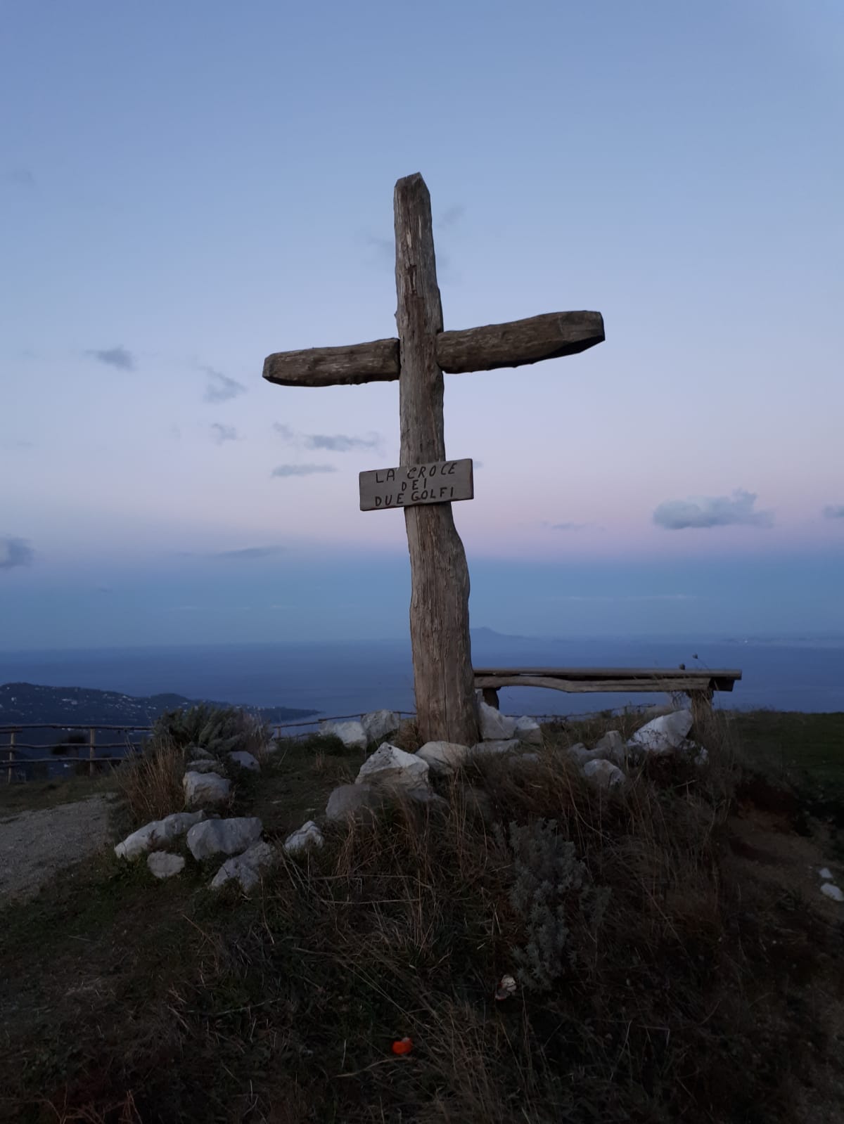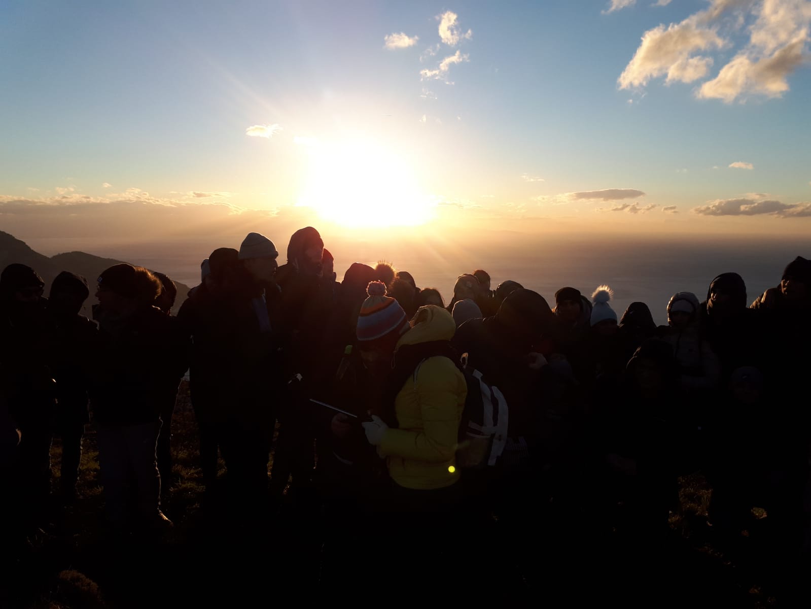 Dopo alcune brevi pause e un’ora di cammino in cui vediamo aumentare gradualmente la luce intorno a noi, arriviamo a Monte Comune alle 7.15. È una distesa pianeggiante, con una vista mozzafiato sul Monte Faito e su Positano e con una croce che si staglia su questo fantastico panorama. Siamo parecchio infreddoliti poiché un vento freddo soffia forte contro di noi e ci mette a dura prova. Dopo aver visto la “croce dei due Golfi”, ci sediamo sull’erba in attesa che sorga il sole alle 7.27; alcune nubi, tuttavia, prolungano la nostra attesa, oscurando il sole.