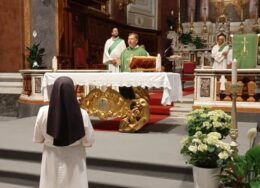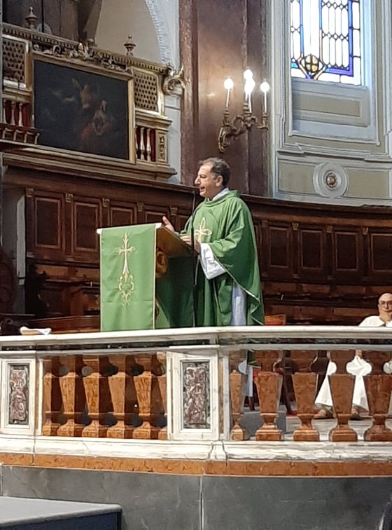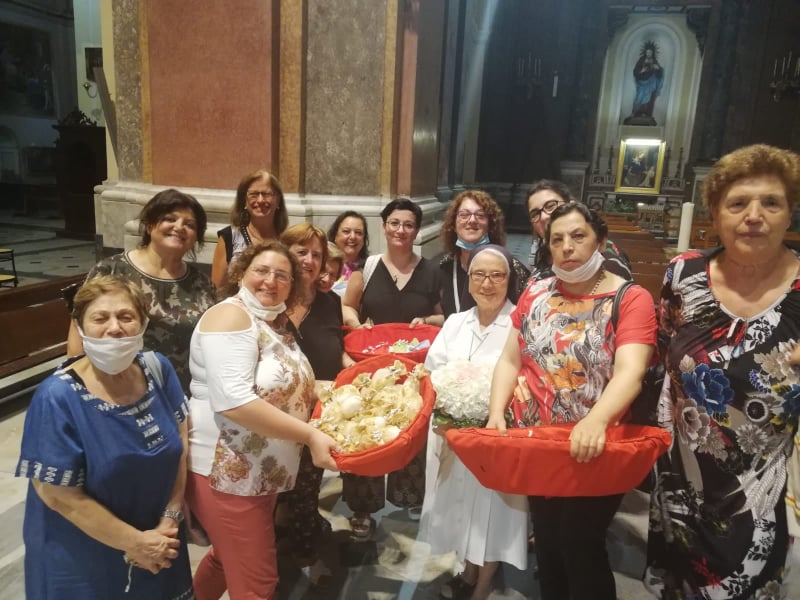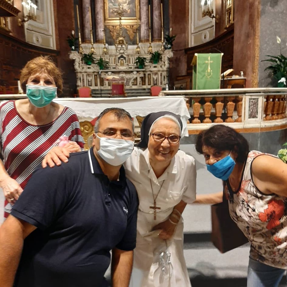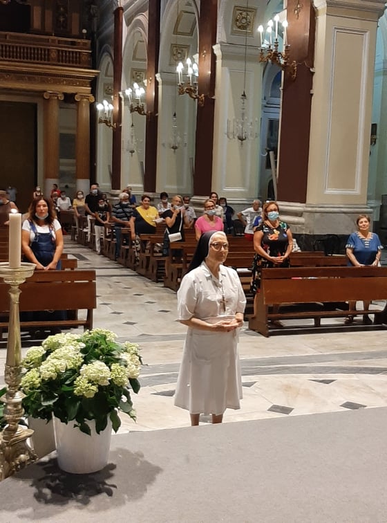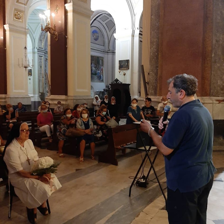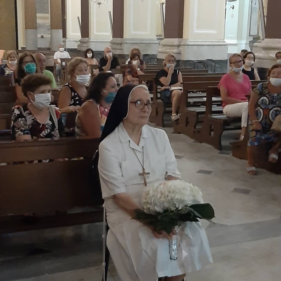Mercoledì 12 agosto nella mia parrocchia “S. Maria Assunta e San Catello” abbiamo festeggiato una nostra cara sorella del convento delle Francescane Stimmatine che in questa data ha festeggiato i 60 anni di vita consacrata: Sr. Giovanna Gentile. Tutto è nato da una proposta di una nostra catechista Emilia Della Monica che ci ha avvisati dell’anniversario e in pochi giorni dal parroco agli altri operatori pastorali della parrocchia, ci siamo organizzati per una celebrazione eucaristica a sorpresa dedicata a lei. Le Cattepax (catechiste Cattedrale e Pace) hanno pensato a confezionare i confetti, ad avvisare tutti invitandoli a realizzare videomessaggi di auguri per lei e il nostro diacono Luigi Russo che ha provveduto al montaggio, ed ha mostrato subito dopo la S. Messa. Il nostro parroco don Antonino ha presieduto insieme a Luigi e al diacono Maurizio Longobardi, la celebrazione Eucaristica queste le sue parole: