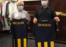 Prima dei saluti finali il presidente Langella e lo staff dirigenziale, sono saliti verso l’altare maggiore, hanno consegnato ad entrambi le nuove magliette della squadra firmate da tutti i giocatori e dal mister Novellino e dopo i ringraziamenti al Vescovo e a Don Antonino per la bella accoglienza, il presidente ha concluso con un bellissimo e applauditissimo: ”Forza Juve Stabia, forza Gialloblù”.
