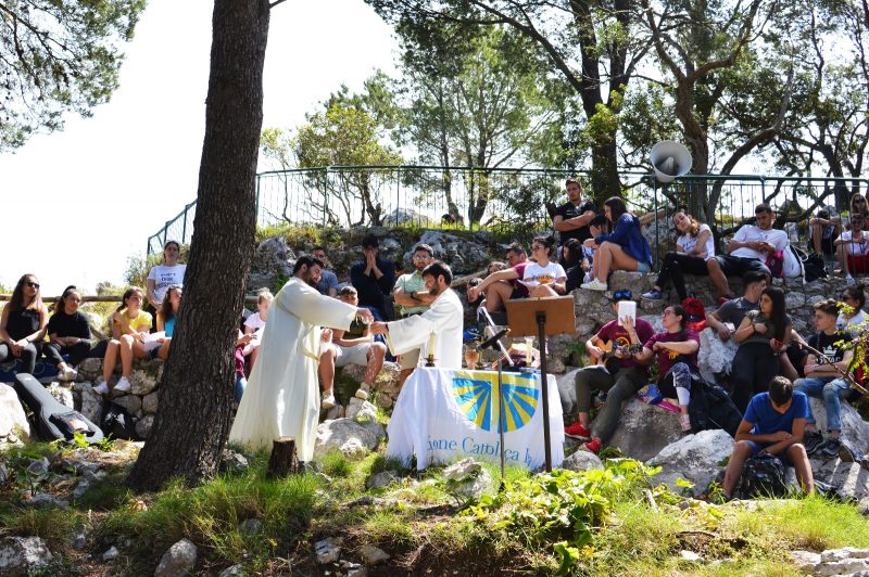 La vista da lì è meravigliosa, da lasciare senza fiato: il cielo e il mare si incontrano e tutto sembra essere incantato, come in una splendida cartolina. E lenorme fatica fatta per salire così in alto diventa nulla al cospetto di tale dono di Dio. Senza di me non potete far nulla: sono le parole dellEvangelista Giovanni che risuonano tra le foglie dei pini marittimi che fanno ombra e proteggono dal sole che illumina Villa Jovis e la rende ancor più magica. E stato allestito un altare, cè anche un leggìo tra lerba e non ci sono panche ma rocce, perché Chiesa è in ogni luogo in cui si prega e si canta nel Suo nome.