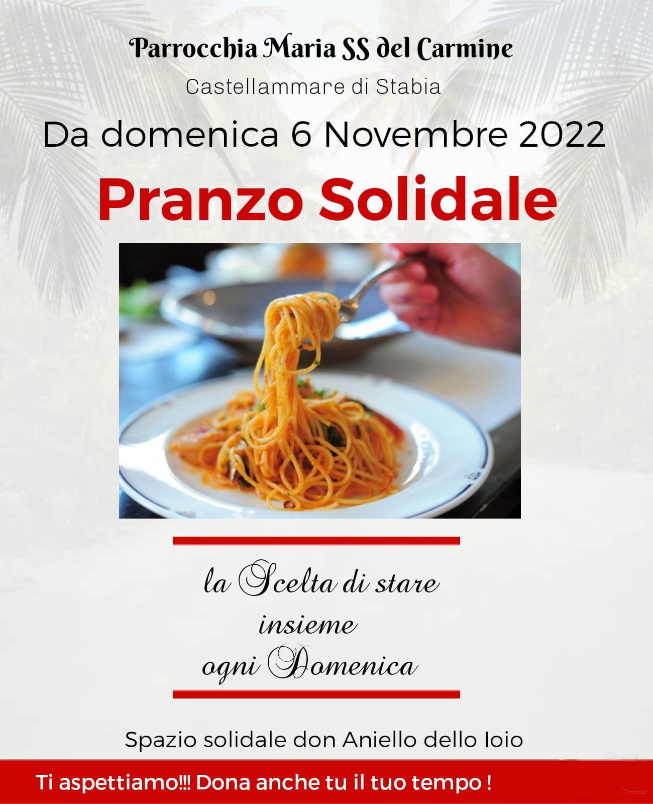 “La scelta di stare insieme ogni domenica”, è con questo spirito di coinvolgimento ed accoglienza, che la Parrocchia Maria SS Del Carmine di Castellammare di Stabia, inaugura domenica 6 novembre il Pranzo Solidale.