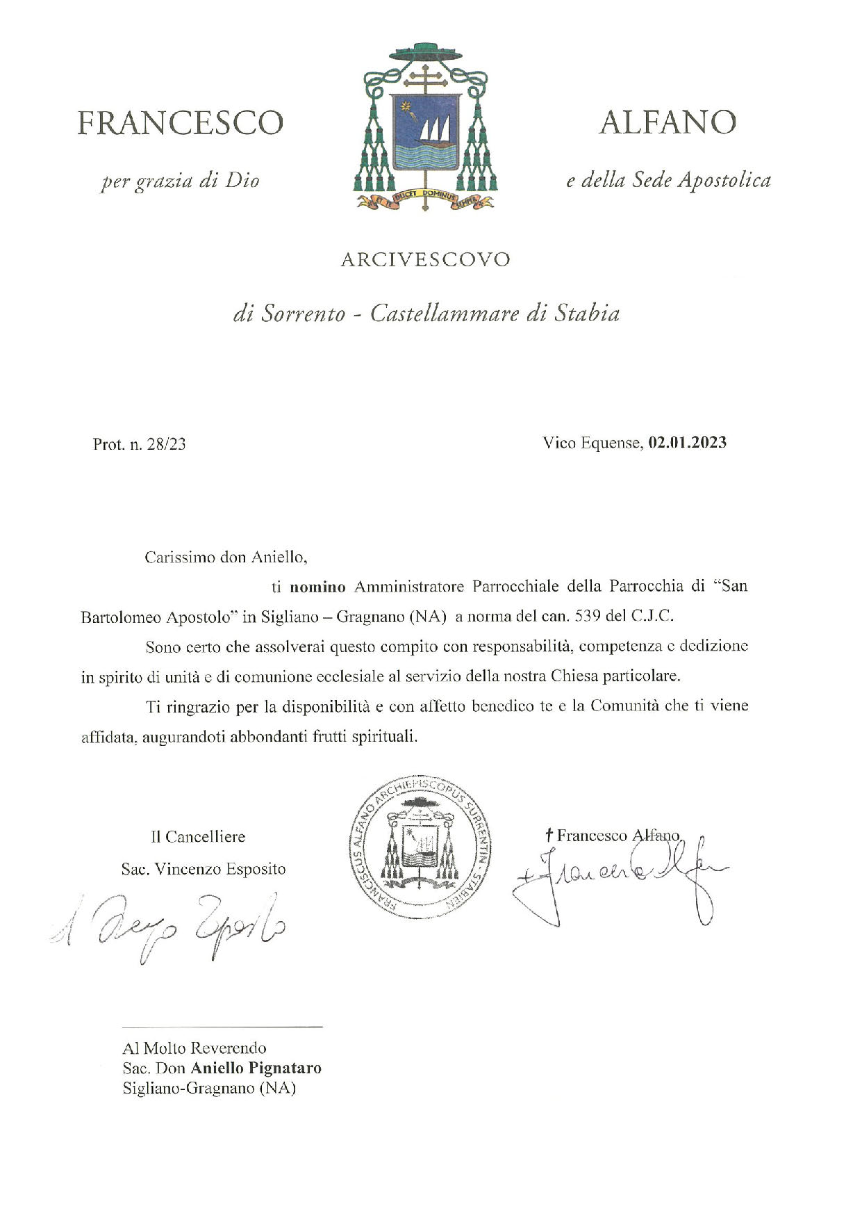 Don Aniello Pignataro, in data 02 gennaio 2023, è stato nominato Amministratore Parrocchiale della parrocchia San Bartolomero Apostolo, Sigliano in Gragnano.