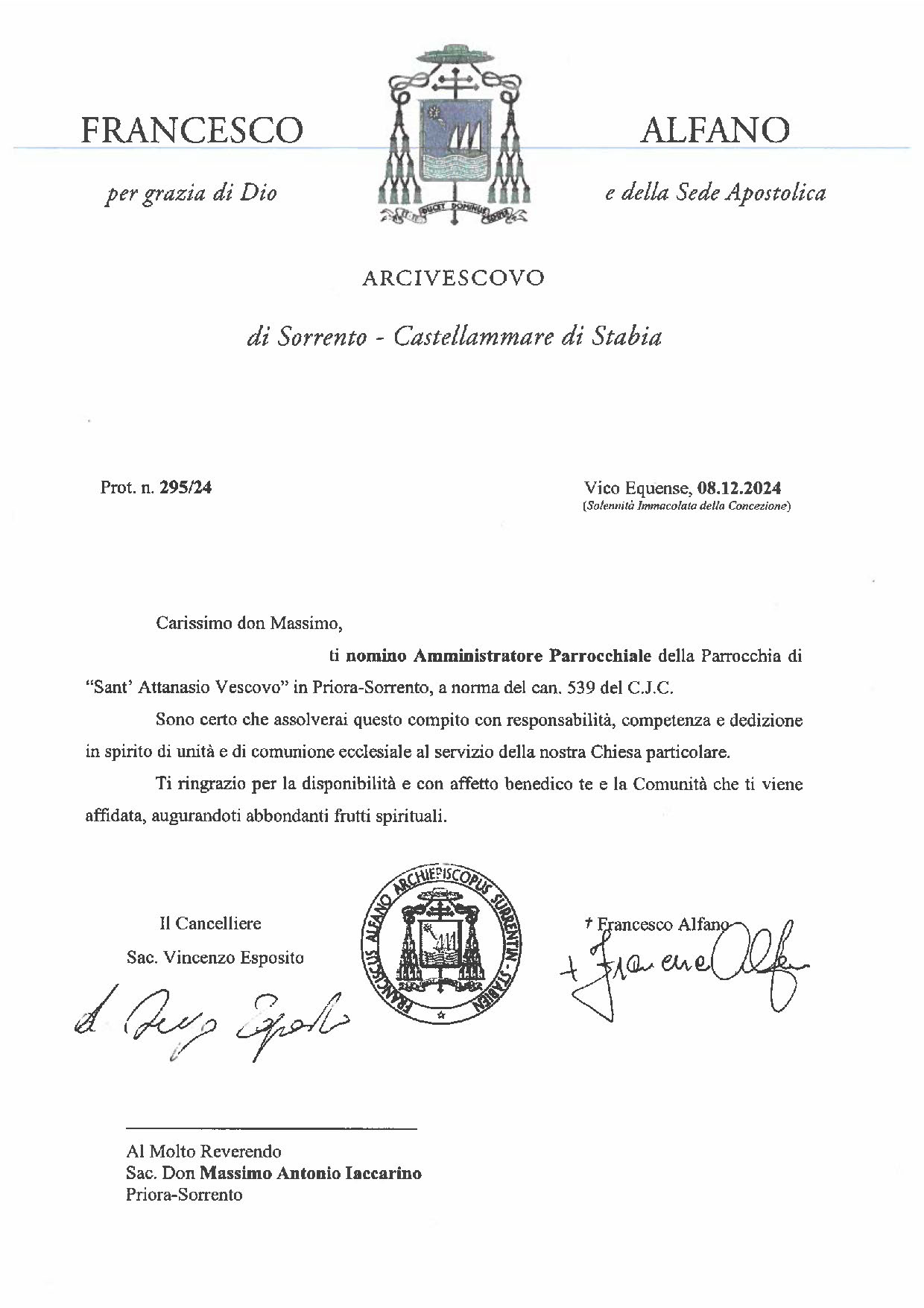 Don Massimo Antonio Iaccarino, in data 08 dicembre 2024, è stato nominato Amministratore Parrocchiale della parrocchia Sant’Attanasio Vescovo, Priora in Sorrento.