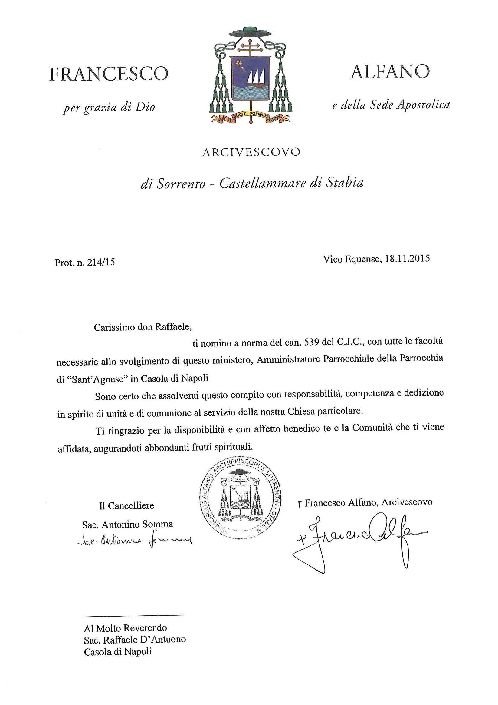 Don Raffale D’Antuono, in data 18 novembre 2015, è stato nominato Amministratore Parrochiale della parrocchia Sant’Agnese in Casola di Napoli.