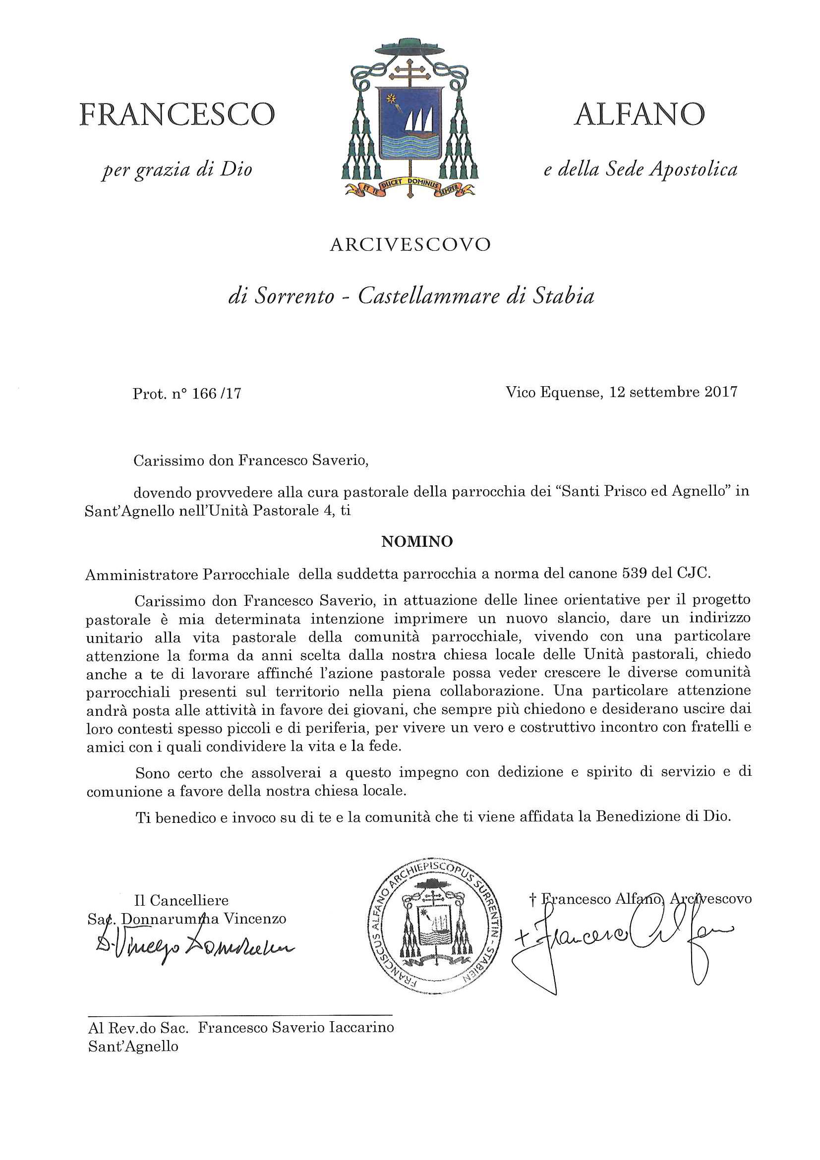 Don Francesco Saverio Iaccarino, in data 12 settembre 2017, è stato nominato Amministratore Parrocchiale della parrocchia Santi Prisco ed Agnello in Sant’Agnello.