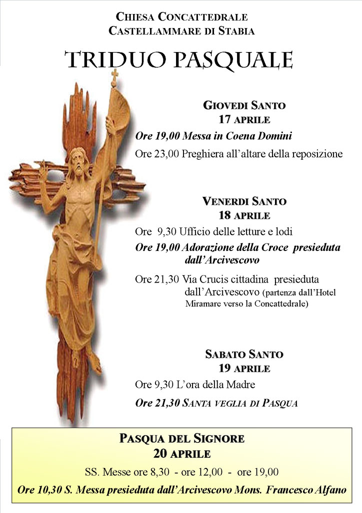 Venerdì 18 aprile nella concattedrale di Castellammare di Stabia, alle ore 18,30, mons. Alfano presiederà lAzione liturgica della Passione del Signore e Adorazione della Croce.