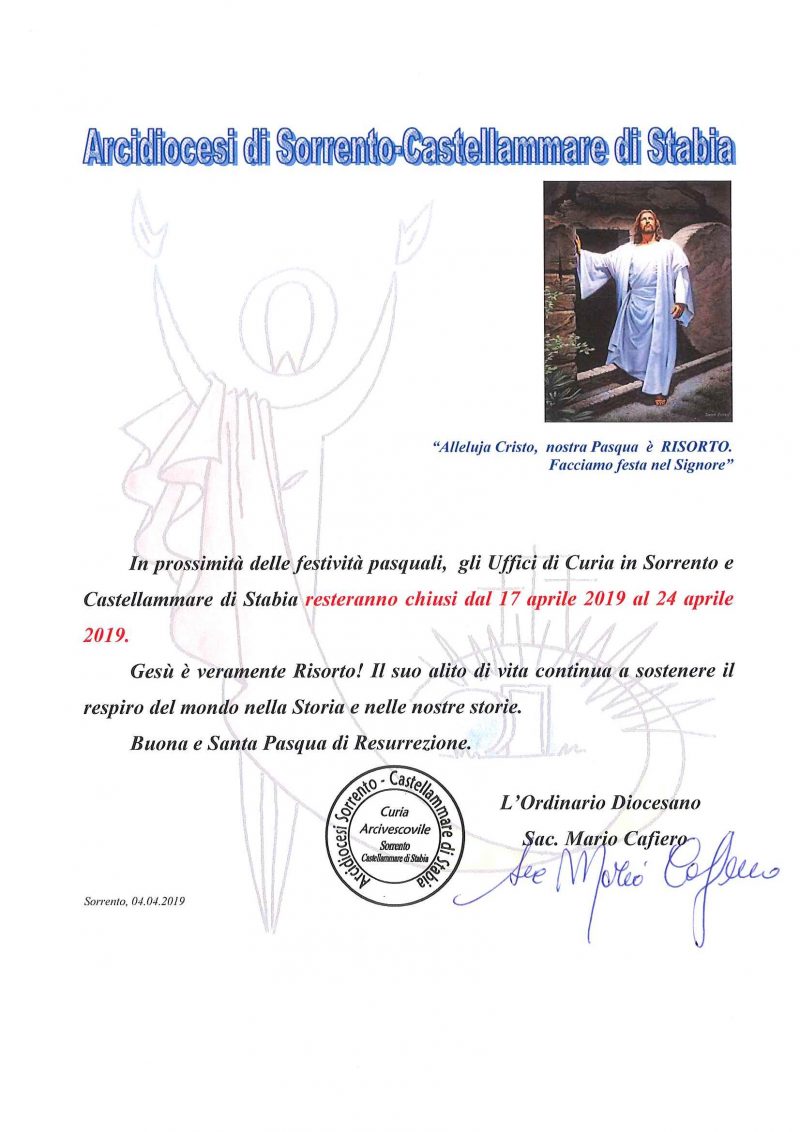 In prossimità delle festività pasquali, gli Uffici di Curia in Sorrento e Castellammare di Stabia resteranno chiusi dal 17 aprile al 24 aprile 2019.