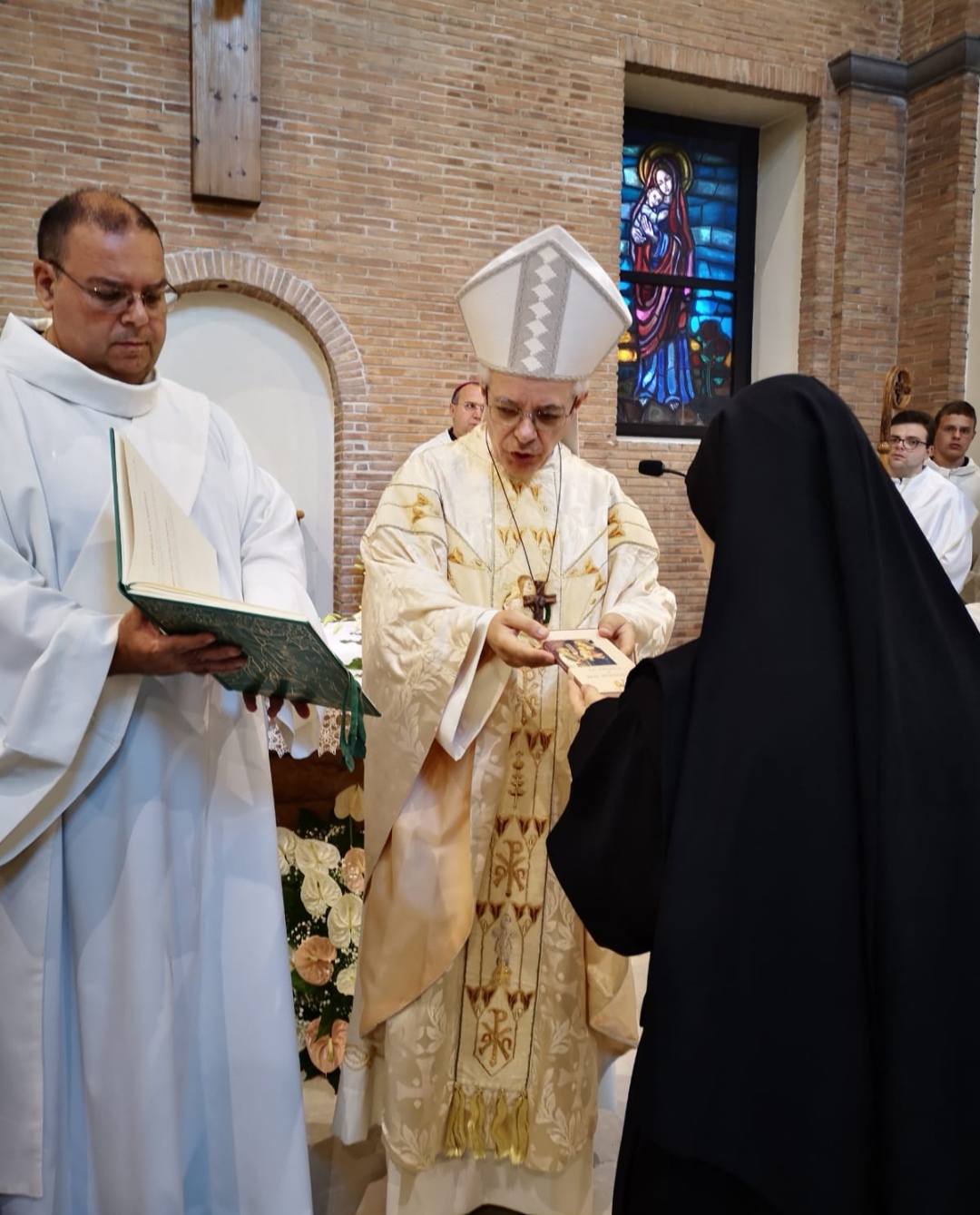 Dopo la proclamazione del Vangelo ha avuto inizio il rito della Benedizione. Una monaca assistente ha accompagnato la monaca eletta Abbadessa al cospetto del vescovo, chiedendone la Benedizione Abbaziale.