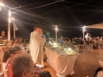 La Minicrociera Al Chiar Di Luna è stata una serata unica! Siamo partiti a bordo della “Patrizia” e, dopo esserci rinfrescati grazie alla brezza marina, abbiamo fatto tappa al largo dei Faraglioni di Capri. Lì abbiamo celebrato la messa ed abbiamo ascoltato alcune canzoni sull’importanza del non sprecare il tempo che Dio ci ha messo a disposizione. Infine, abbiamo consumato la cena tutti insieme. È stata una bellissima serata di relax, di divertimento, di chiacchierate in compagnia e, soprattutto, di preghiera.