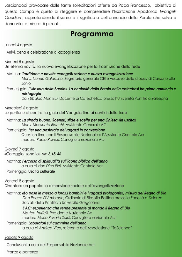 Il secondo appuntamento ci riguarda più da vicino, perché si svolge nella nostra diocesi. Per i responsabili è riservato il Campo specializzato dal titolo «Evangelii Gaudium. Chiamati ad essere dono della bellezza che non si spegne», a Castellammare di Stabia (Na), dal 4 al 9 agosto. I destinatari di tale proposta sono i responsabili e assistenti diocesani e gli incaricati e assistenti regionali dellAcr. Lobiettivo è rileggere e approfondire lesortazione apostolica Evangelii Gaudium, lasciandosi provocare dallinsegnamento che Papa Francesco offre, mettendo al centro il valore della dimensione sociale e associativa per levangelizzazione.