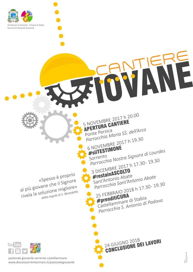 Ad ottobre 2018 sarà celebrato il Sinodo sui giovani voluto fortemente da Papa Francesco ed anche la nostra chiesa diocesana si prepara a questo importante appuntamento. In ascolto delle risposte ricevute dai questionari precedentemente inviati, abbiamo avvertito la necessità di approfondire alcuni aspetti che riguardano il rapporto tra giovani e Chiesa nella nostra diocesi. Si è perciò deciso di dare vita al “Cantiere giovani: il futuro é già presente”. Questo appuntamento prevede le seguenti tappe: