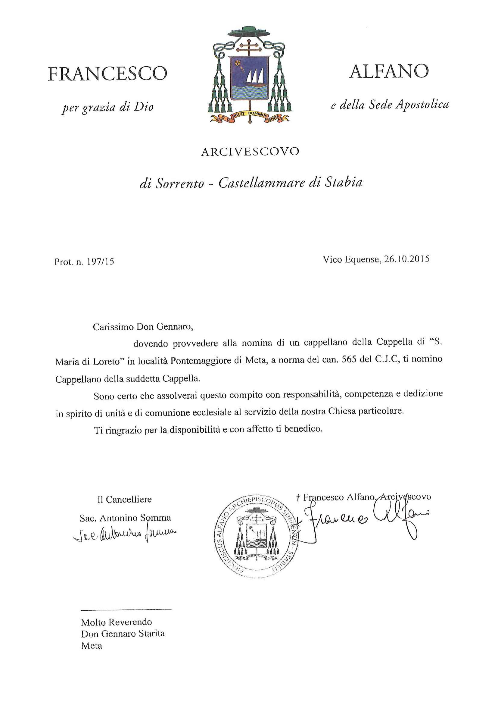 Don Gennaro Starita, è stato nominato il 26 ottobre 2015 Cappellano della Cappella Santa Maria di Loreto in località Pontemaggiore di Meta