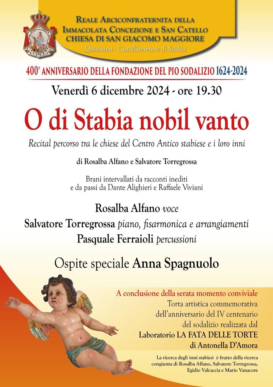 La sera di venerdì 6 dicembre, inoltre, a conclusione della Santa Messa, celebrata con la partecipazione dei confratelli delle altre congreghe cittadine, si svolgerà (ore 19.30) un inedito concerto dal titolo “O di Stabia Nobil Vanto”: di e con Rosalba Alfano e Salvatore Torregrossa con Pasquale Ferraioli e la partecipazione speciale di Anna Spagnuolo. I brani saranno intervallati da racconti inediti e da passi da Dante Alighieri e Raffaele Viviani.