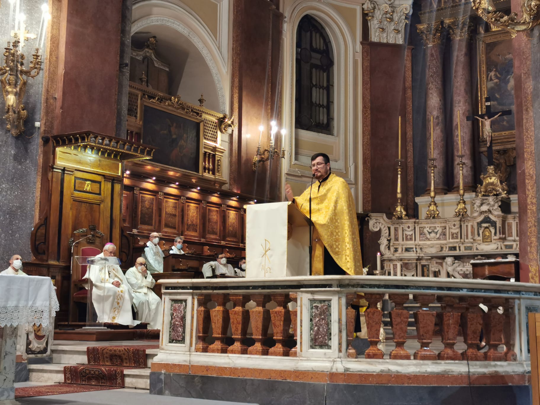 Padre Igor indossa un paramento dorato, sembra quasi richiamare le sfumature della sua terra, così come quelle del sole, quello stesso sole che speriamo possa tornare a risplendere.