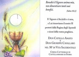Celebrazione solenne e serena, ieri pomeriggio, nella concattedrale di Castellammare: la testimonianza affettuosa e semplicissima di don Catellino Amato e don Peppino Cavallaro ci hanno toccato il cuore! Con poche parole, nella Preghiera, hanno abbracciato tutti: il vescovo che li ha ordinati mons.Agostino D’Arco (Ischia, 5 marzo 1899 +Castellammare di Stabia, 21 settembre 1966), […]