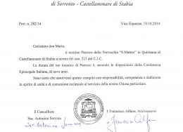 Don Gerardo Cesarano è stato nominato amministratore parrocchiale della parrocchia di Santa Maria Assunta a Castello, nel comune di Gragnano, il 22 settembre 2014.