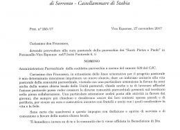 Don Francesco Di Palma, in data 27 novembre 2017, è stato nominato Amministratore Parrocchiale della parrocchia Santi Pietro e Paolo in Fornacelle Vico Equense.