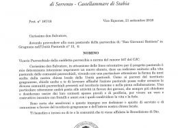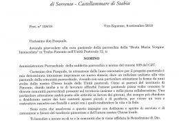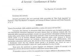 Don Antonio D’Urso, in data 21 settembre 2018, è stato nominato Vicario Parrocchiale per le Parrocchie San Paolo Apostolo in Pastena e San Vito Martire in Acquara – Massa Lubrense.