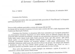 Don Gennaro Giordano, in data 09 settembre 2018 è stato nominato Parroco della Parrocchia Beata Maria Vergine Immacolata di Lourdes e Sant’Agostino Vescovo e Dottore in Castellammare di Stabia.