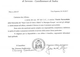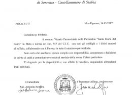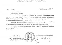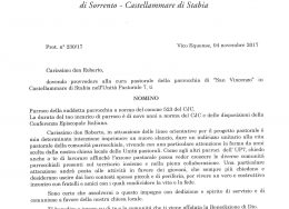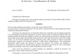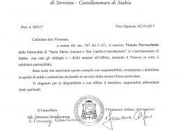 Don Vincenzo Vitiello, in data 2 ottobre 2017, è stato nominato Vicario Parrochiale della parrocchia Santa Maria Assunta e San Catello (Concattedrale) in Castellammare di Stabia.