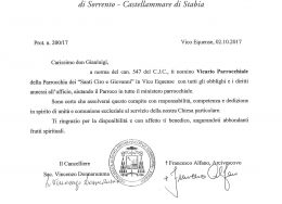Don Gianluigi Persico, in data 2 ottobre 2017, è stato nominato Vicario Parrochiale della parrocchia Santi Ciro e Giovanni in Vico Equense.