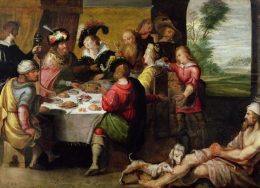 Dal vangelo secondo Luca In quel tempo, Gesù disse ai farisei: «C’era un uomo ricco, che indossava vestiti di porpora e di lino finissimo, e ogni giorno si dava a lauti banchetti. Un povero, di nome Lazzaro, stava alla sua porta, coperto di piaghe, bramoso di sfamarsi con quello che cadeva dalla tavola del ricco; […]