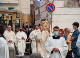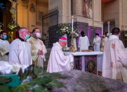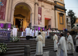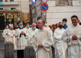Ad esplicare i riti durante la celebrazione, accanto a Mons. Alfano, il Vicario Generale Don Mario Cafiero, Don Antonino d’Esposito, Vicario per il Clero ed il Rettore del Seminario di Posillipo Don Francesco Beneduce.