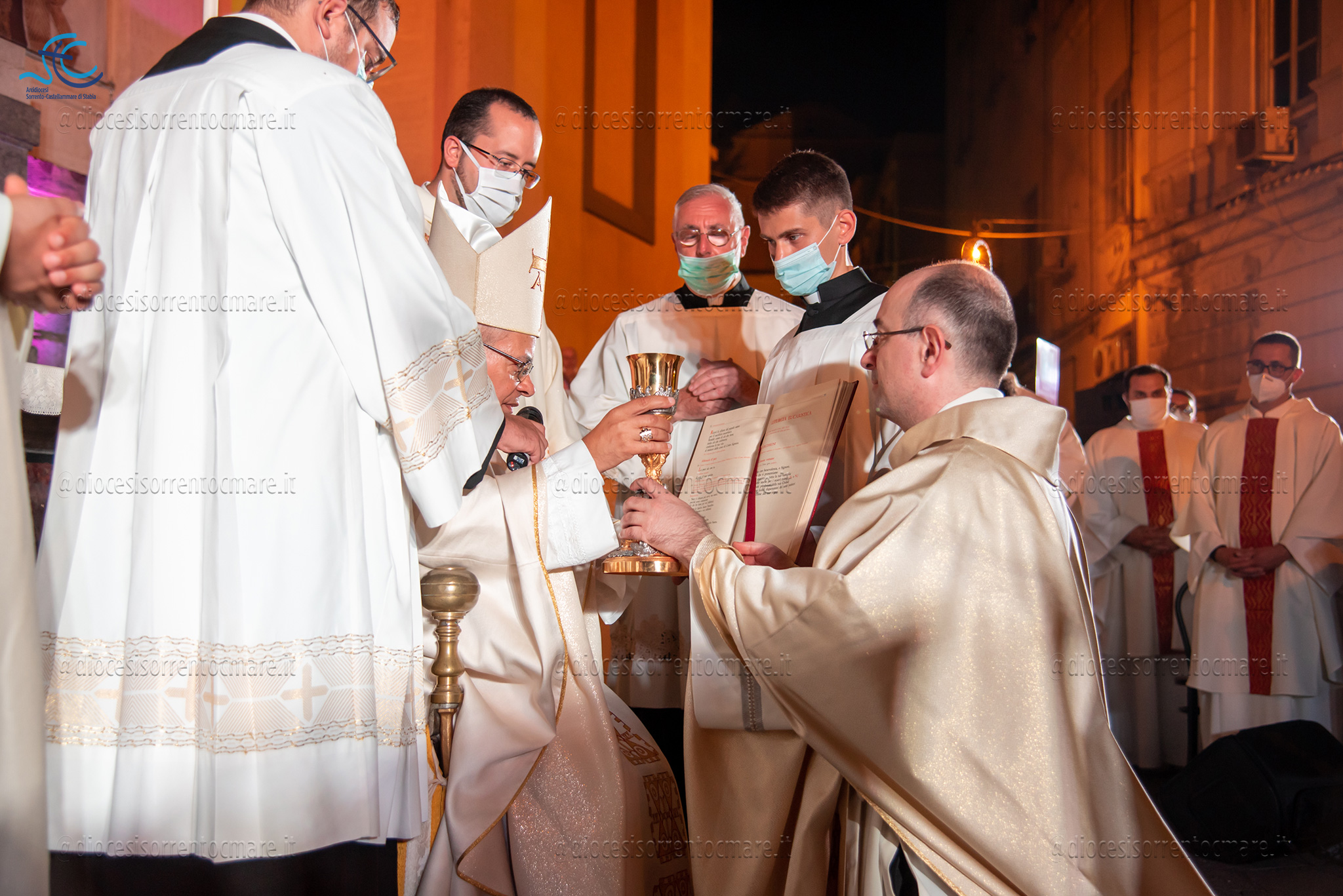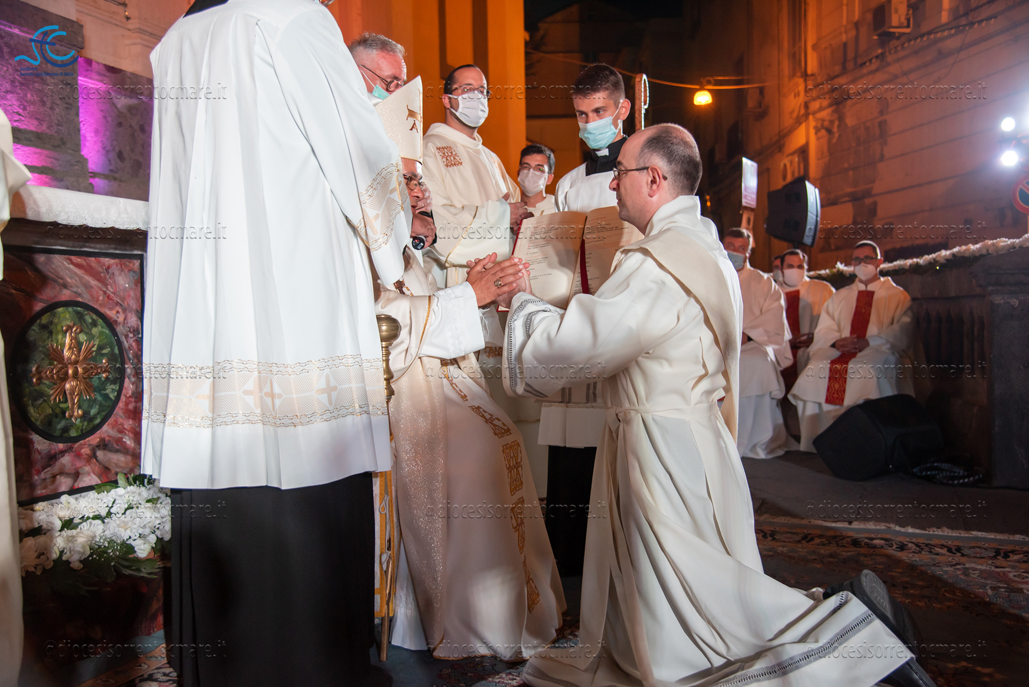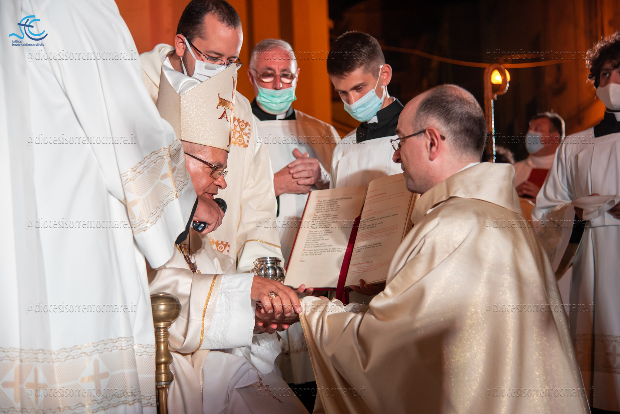 Ad esplicare i riti durante la celebrazione, accanto a Mons. Alfano, il Vicario Generale Don Mario Cafiero, Don Antonino d’Esposito, Vicario per il Clero ed il Rettore del Seminario di Posillipo Don Francesco Beneduce.