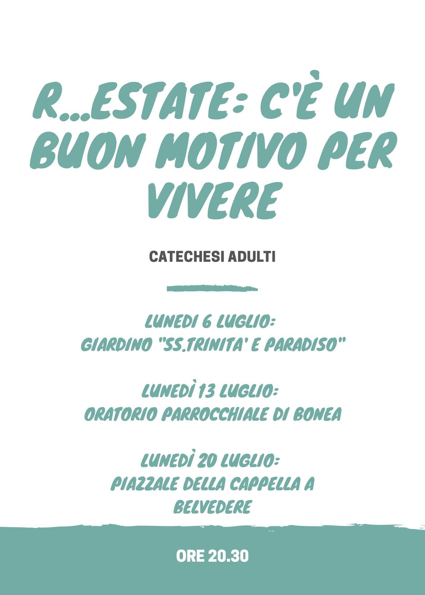 Non mancheranno nemmeno i collaudati appuntamenti estivi per gli adulti, come ormai da qualche anno condivisi con le comunità parrocchiali di Bonea e Massaquano; dopo un po’ di tempo ci si ritrova anche per dare una lettura sapiente al tempo che abbiamo attraversato e per poter sottolineare qualche “grazia” che il Signore ha operato con noi anche nella prova. L’appuntamento per loro sarà il lunedì, anche qui godendo degli spazi parrocchiali e del gusto di ritrovarsi come comunità sorelle.