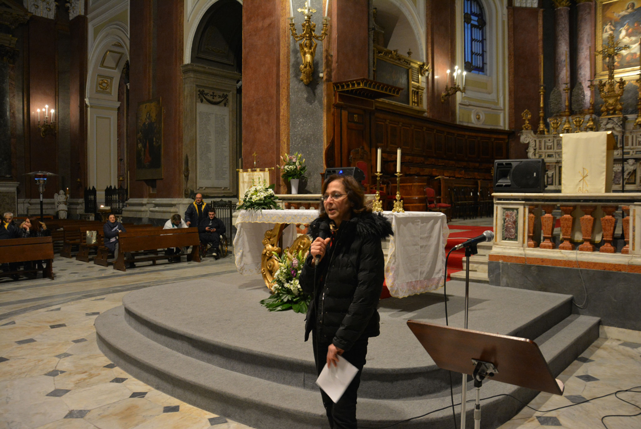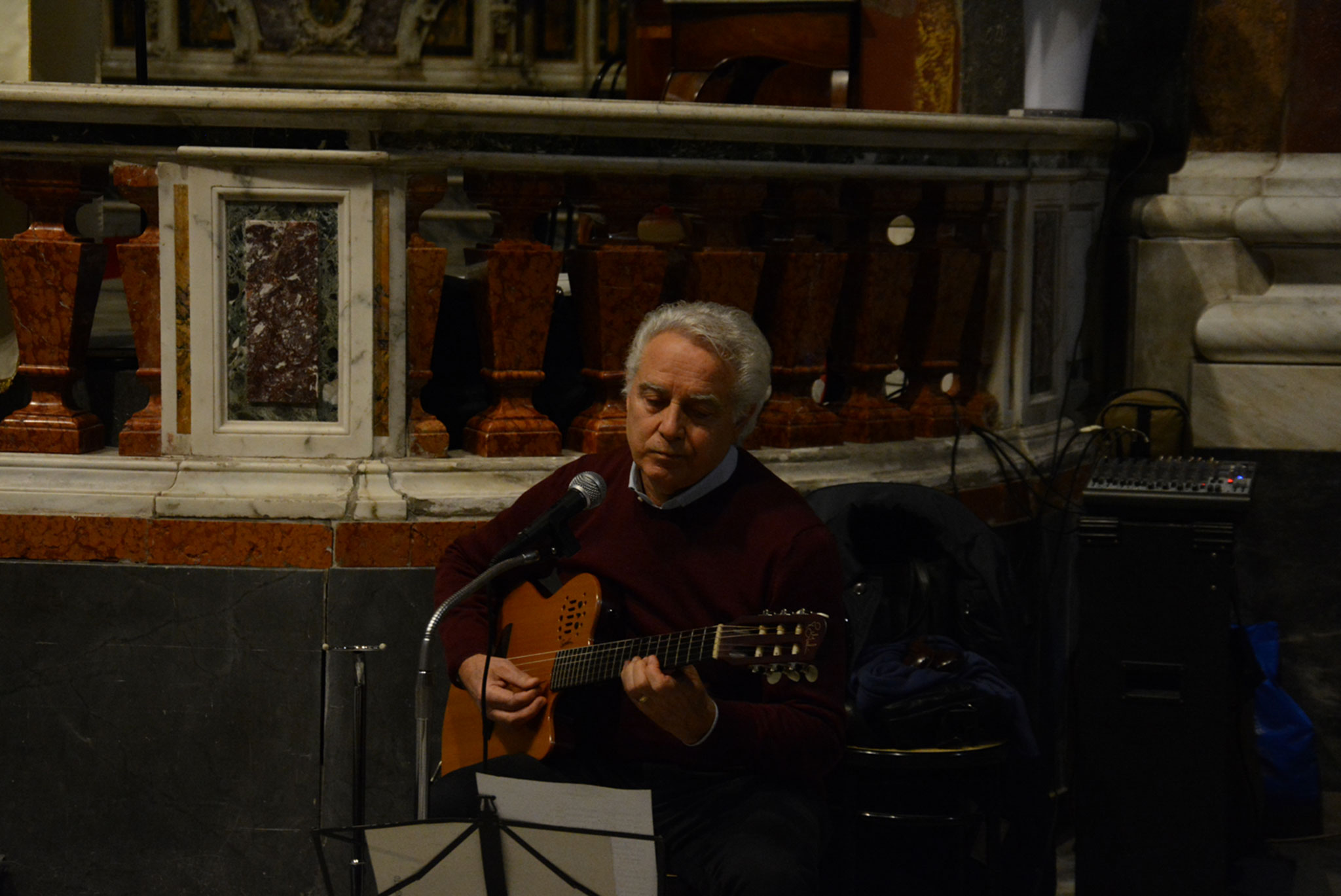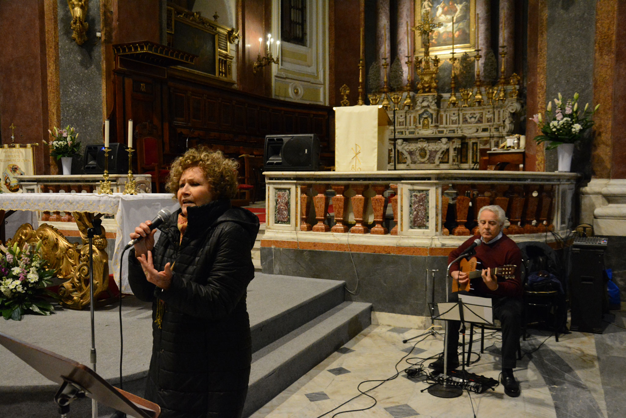 Si arriva pian piano, qualcuno si ferma a salutare gli amici, qualcuno è ancora fuori, sul sagrato; ma appena la bravissima Rosalba Spagnuolo apre l’incontro col primo dei canto dedicati a Maria, accompagnata dalla chitarra di suo marito Francesco Cesarano, tutti si affrettano a prendere posto, in un silenzio carico di ascolto.