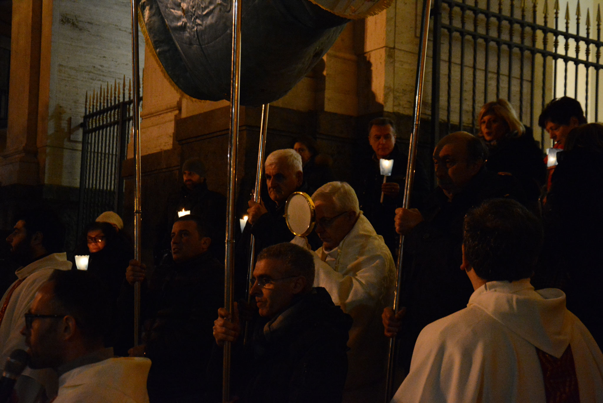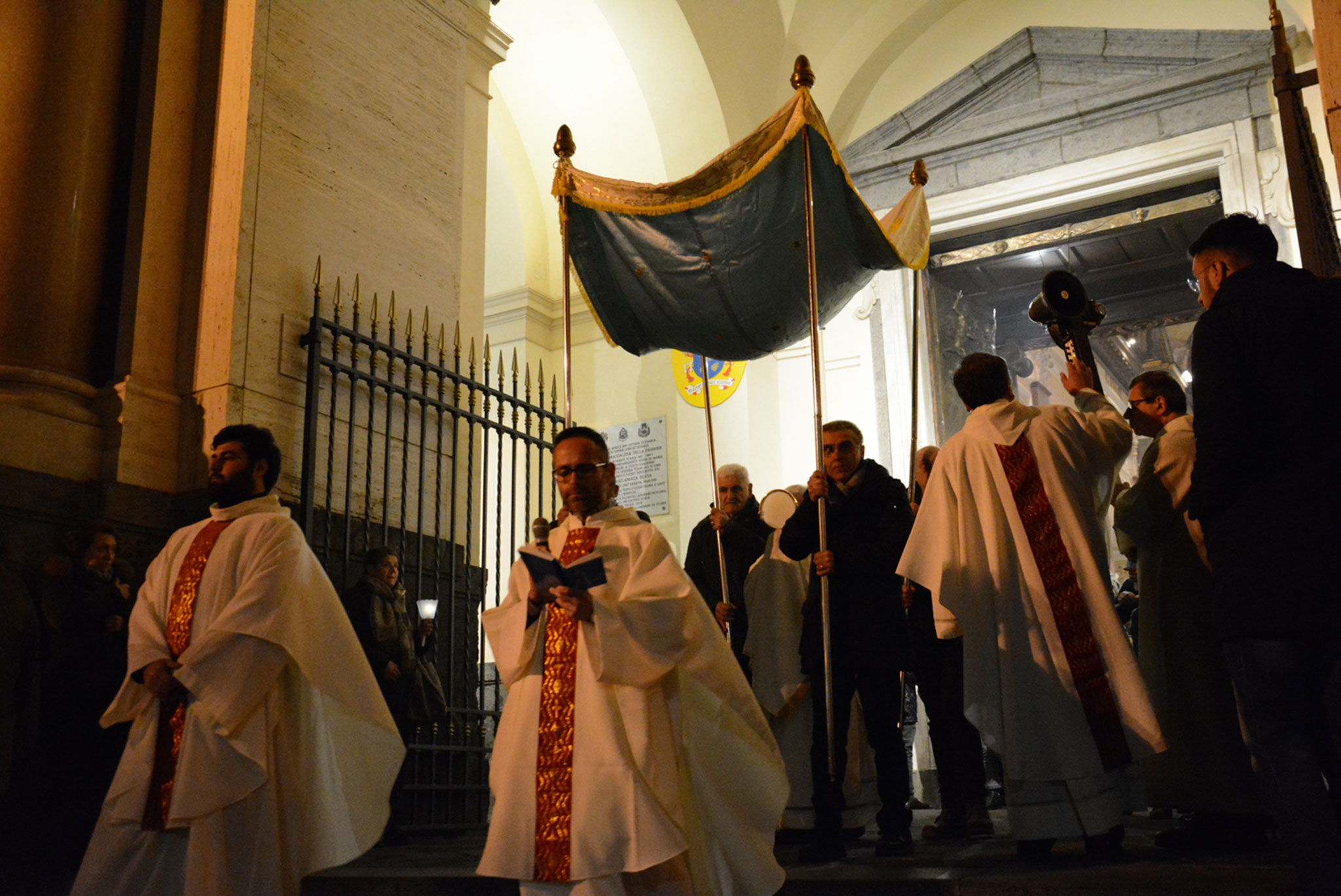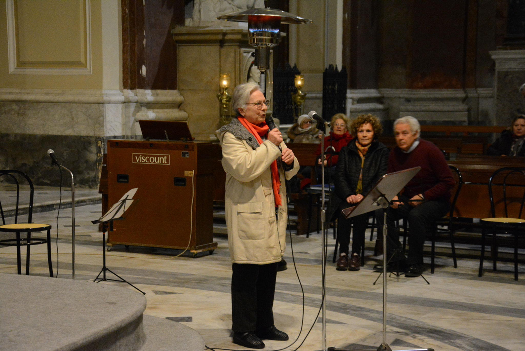 Si arriva pian piano, qualcuno si ferma a salutare gli amici, qualcuno è ancora fuori, sul sagrato; ma appena la bravissima Rosalba Spagnuolo apre l’incontro col primo dei canto dedicati a Maria, accompagnata dalla chitarra di suo marito Francesco Cesarano, tutti si affrettano a prendere posto, in un silenzio carico di ascolto.