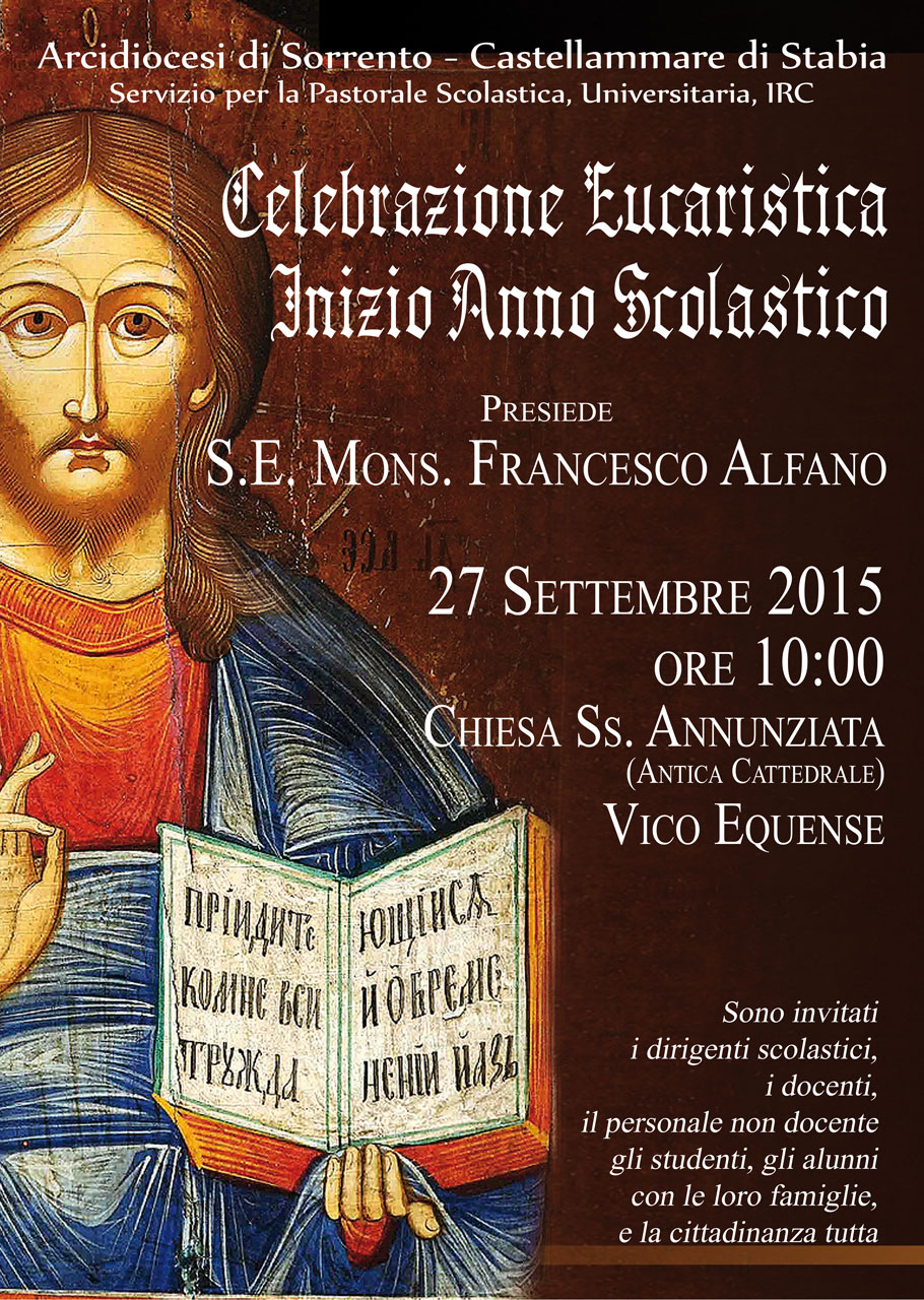 Il Servizio per la Pastorale Scolastica, Universitaria e IRC, invita i docenti, i dirigenti, il personale non docente, gli studenti, gli alunni e le loro famiglie, alla Celebrazione Eucaristica, presieduta dal nostro Arcivescovo S.E. Mons. Alfano.