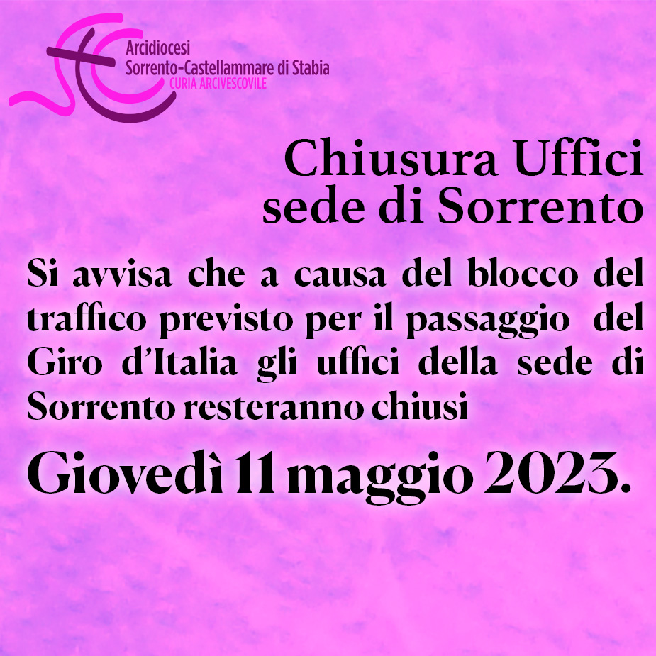 Si avvisa che a causa del blocco del traffico previsto per il passaggio del Giro d’Italia gli uffici della sede di Sorrento resteranno chiusi Giovedì 11 maggio 2023.
