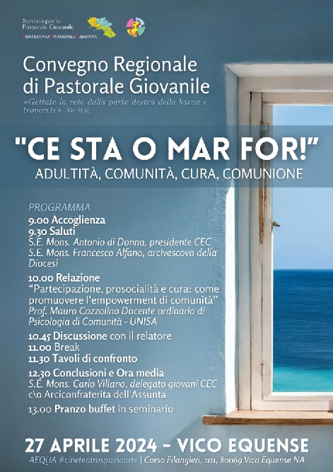 Il giorno 27 aprile 2024 alle ore 9.30 torna l’appuntamento con il Convegno Regionale di Pastorale Giovanile che quest’anno avrà come titolo “Ce sta o mar for!”, dalla nota serie tv. La nostra riflessione pastorale guidata dal Vescovo delegato CEC Mons. Villano, che ha avuto inizio mesi fa al termine della GMG, non può che aprirsi a quella dei personaggi della serie tanto amata dai giovani, che ci dà occasione di un’analisi che nasce dal loro pensiero. La tematica, che si focalizzerà in particolare su adultità, comunità, cura e comunione ci prepara anche al Convegno nazionale di Maggio.