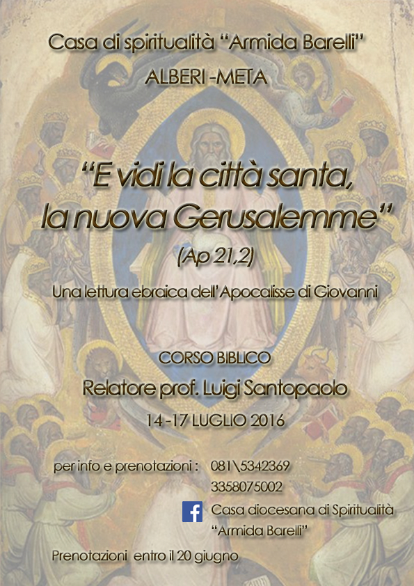 vi raggiungo per ricordarvi lappuntamento con il Corso Biblico E vidi la città santa, la nuova Gerusalemme (Ap21,2) con il professore Luigi Santopaolo nei giorni 14-17 luglio 2016.