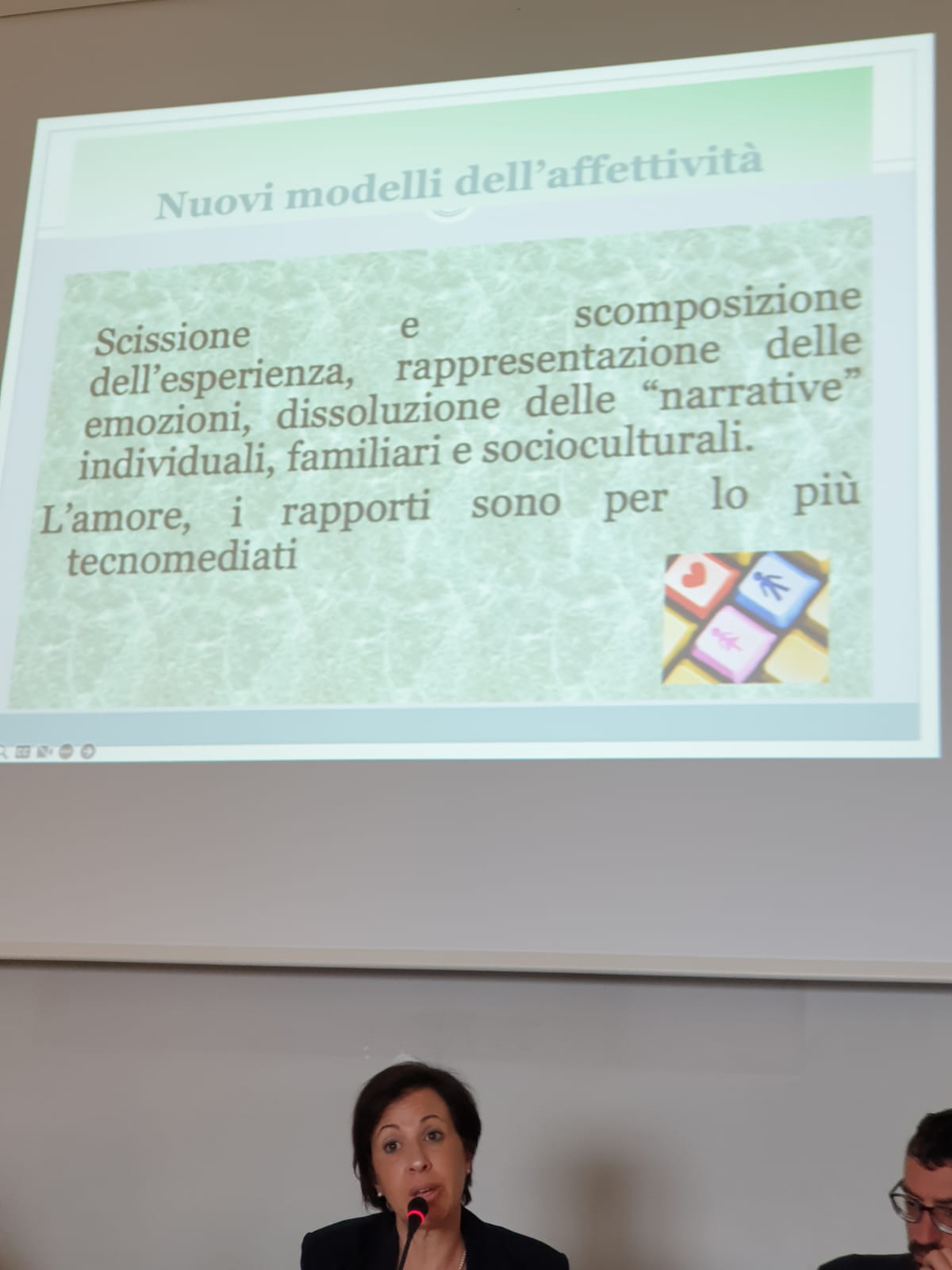 La prof.ssa Pensavalli ha illustrato i nuovi modelli dell’affettività indicando anche le caratteristiche degli abitanti della società liquida postmoderna.