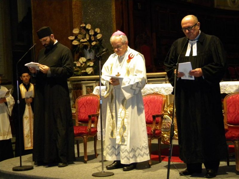 Non importa a quale confessione apparteniamo, la preghiera è sempre la possibilità di salvezza che non diventa tentazione di fuga ma convinzione che soltanto vivendo all’insegna di Cristo si possa vivere bene, solo vivendo con Lui e per Lui si possa superare il licenziamento, la fine di un rapporto, la perdita di legami e la morte di chi si ama. Ed è questo che conta, questo che accomuna le tre confessioni religiose in questione, che nonostante diversità di forma, contenutisticamente non potrebbero essere più uguali. E questo ha influito sul clima della serata: si aveva la netta e chiara sensazione di essere parte di un’unica grande famiglia comunitaria, un blocco unitario senza differenze (questo anche grazie anche ai due cantori ortodossi). Forse le barriere sono un artificio umano, o forse l’evoluzione di divergenze storiche ma l’azione dello Spirito Santo ha permesso la realizzazione di un momento di estrema condivisione, unicità e complementarità.