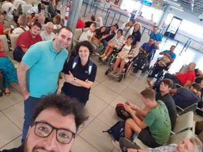 Dunque un pellegrinaggio con giovani segnati da qualche disagio, fisico o di altra natura, accompagnarti da altri giovani volontari disposti a condividere la gioia e la fatica del vivere insieme, almeno per qualche giorno. Ora che la prima giornata sta per concludersi sento già di ringraziare il Signore dal profondo del cuore. È stato bello vedere come un po’ alla volta, anzi abbastanza in fretta, ci si è conosciuti fino ad entrare subito in amicizia. Nemmeno i disagi, causati dal ritardo del volo (siamo partiti dall’aeroporto di Ciampino con più di 4 ore di ritardo!), hanno frenato la voglia di stringere relazioni e di fare gruppo. Confesso che mi sono persino commosso dentro di me notando la delicatezza e la pazienza con cui alcuni cercavano di stare accanto a chi aveva maggiore bisogno di attenzione e affetto. Insomma, un piccolo gruppo ma affiatato fin dall’inizio e ben disposto anche ad affrontare gli inevitabili sacrifici! I responsabili dell’Opera Diocesana Pellegrinaggi hanno contribuito a loro volta in modo determinante a farci respirare aria di famiglia, con la loro competenza e passione, aiutando tutti a superare i piccoli o grandi disagi della giornata.