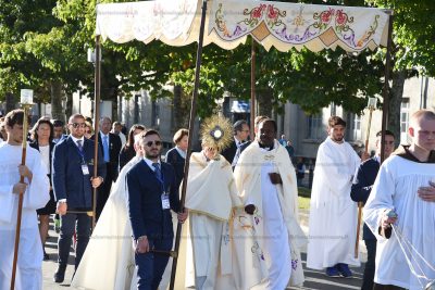 L’altro appuntamento della giornata è la processione eucaristica del pomeriggio. Il bel sole che è tornato a splendere e a riscaldare ci ha accompagnati lungo il percorso verso la basilica sotterranea, favorendo la partecipazione anche di quelli che erano più preoccupati o in difficoltà. Camminare con Gesù, andando dietro a Lui come suoi discepoli-missionari: non un mero momento devozionale, ma una scelta coraggiosa e forte, che ci permette di non restare fermi o chiusi nelle nostre paure, ma di uscire per incontrare tutti coloro che sono ai margini, senza speranza, lasciati soli da una società distratta o addirittura da una comunità ecclesiale tentata dall’indifferenza. Adorare il Signore nel silenzio del cuore e amarlo nei fratelli più poveri non sono due azioni alternative o parallele, ma l’unica vera modalità per essere testimoni del Risorto. Anche qui ci viene in aiuto Bernadette, con il suo amore all’Eucaristia e ai poveri, diventati il fine unico della sua esistenza continuata con fedeltà dopo le apparizioni, nel silenzio del monastero dove volle trascorrere il resto della sua vita.