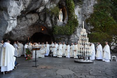 Innanzitutto la Messa alla Grotta. La celebrazione eucaristica al mattino presto, con l’aria piuttosto fredda, in un silenzio profondo, insieme ad altri gruppi di pellegrini italiani: è l’incontro più forte e coinvolgente, che aiuta a partecipare con grande raccoglimento al mistero centrale della nostra fede. Si rimane sempre stupiti quando ci si ritrova in questo luogo, che era ai tempi di Bernadette un vero e proprio immondezzaio e che da più di un secolo e mezzo è diventato un grande santuario all’aperto, che accoglie uomini e donne di ogni parte del mondo e li avvicina a Dio. Ogni volta che mi ritrovo a celebrare la Messa o a presiederla, come questa mattina, avverto nel cuore una immensa gioia, come un flusso di santità che raggiunge tutti e apre cammini di vita nuova per ognuno dei presenti. È il più bel miracolo che sta sotto gli occhi di tutti e che consente di guardare avanti con fiducia.