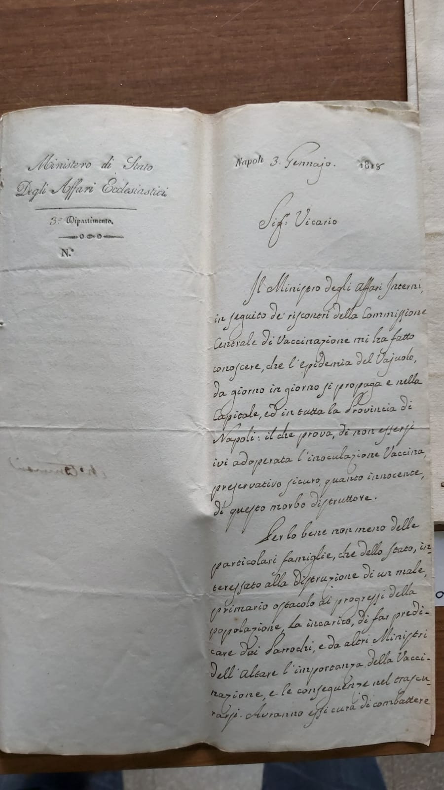 Si tratta di una lettera del tre gennaio 1818 del Ministero degli Affari Ecclesiastici del Regno delle Due Sicilie indirizzata al Vicario Capitolare della diocesi di Vico, vacante dal 1799 per la morte violenta del suo ultimo vescovo mons. Michele Natale. Nella lettera, si invitava il Vicario a farsi promotore presso i parroci e tutti i sacerdoti affinchè dall’altare convincessero i fedeli a vaccinarsi contro il vaiolo, ammonendoli anche delle conseguenze che avrebbe comportato un agire contrario.