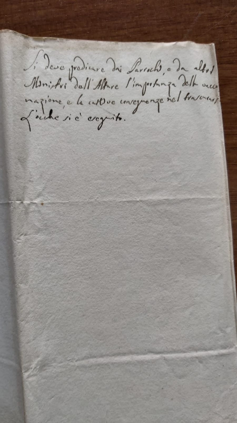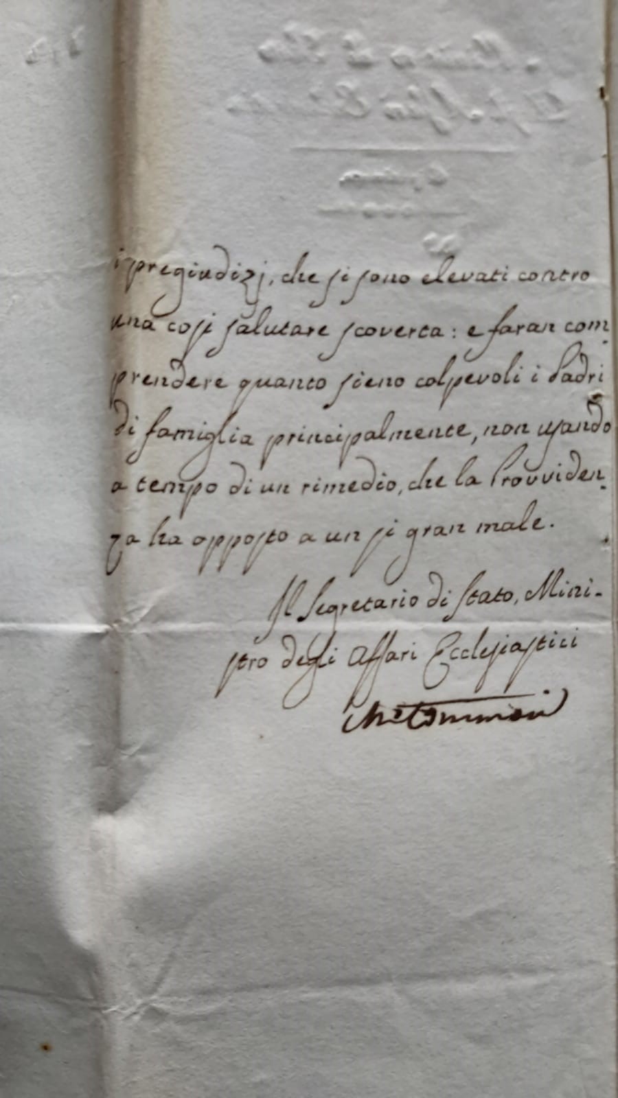 Per lo bene non meno delle particolari famiglie, che dello stato, interessato alla distruzione di un male, primario ostacolo ai progressi della popolazione, La incarico, di far predicare dai Parrochi e da altri Ministri dell’Altare l’Importanza della vaccinazione, e le conseguenze nel trascurarsi. Avranno essi cura di combattere i pregiudizi, che si sono elevati contro una così salutare scoverta: e faran comprendere quanto sieno colpevoli li Padri di famiglia principalmente, non usando a tempo di un rimedio, che la Provvidenza ha opposto a un sì gran male.