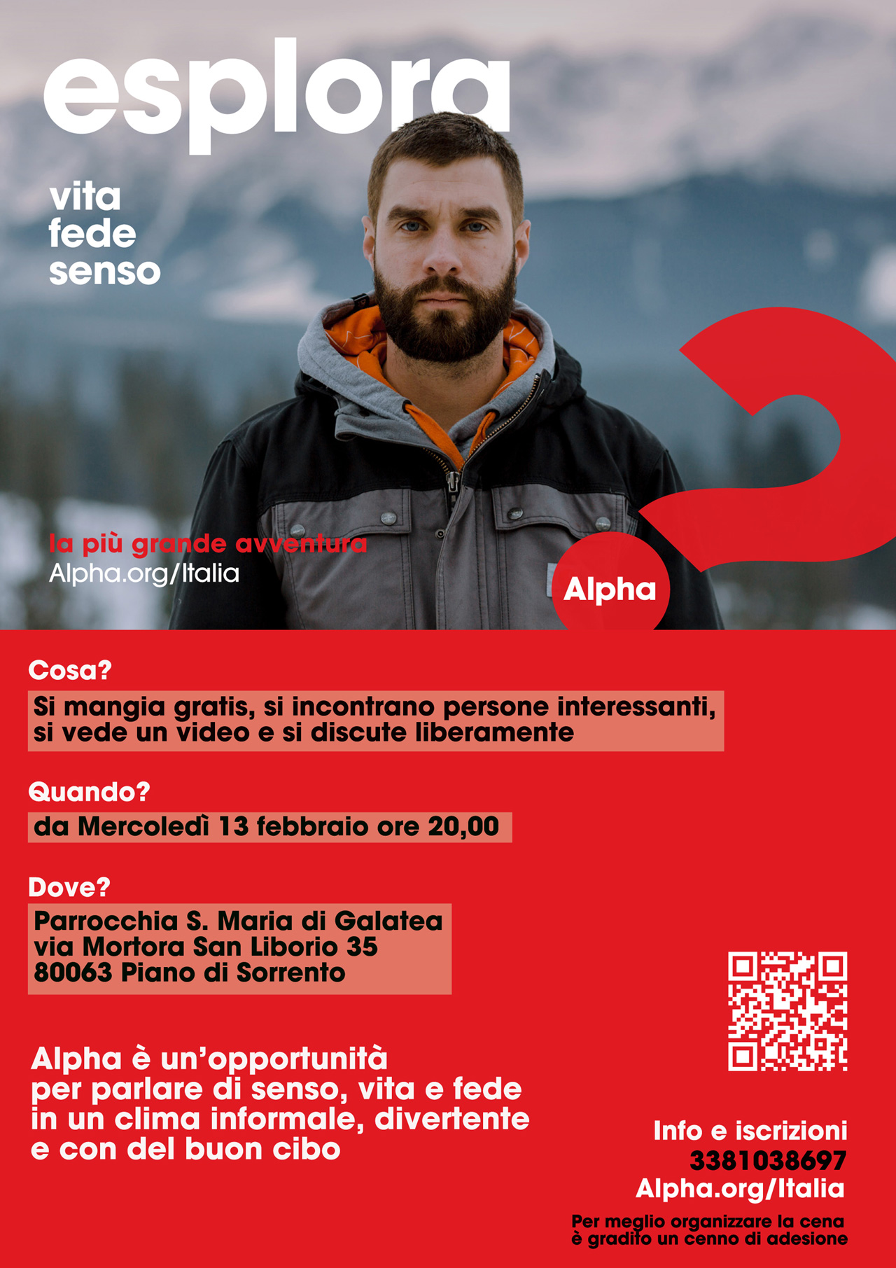 Alpha è un corso di 11 settimane per esplorare la fede cristiana, pensato sia per i lontani e gli scettici che non hanno smesso di porsi le grandi domande della vita, sia per cristiani praticanti che hanno bisogno di ripartire e confrontarsi sinceramente anche a partire dai propri dubbi. Ogni sessione pone una domanda riguardo alla fede affinché tutti possano discutere liberamente. Viene svolto in tutto il mondo: nelle chiese, nelle università, nelle case… Ogni corso Alpha ha in comune tre aspetti: il cibo, la presentazione di un tema e una conversazione libera in piccoli gruppi.