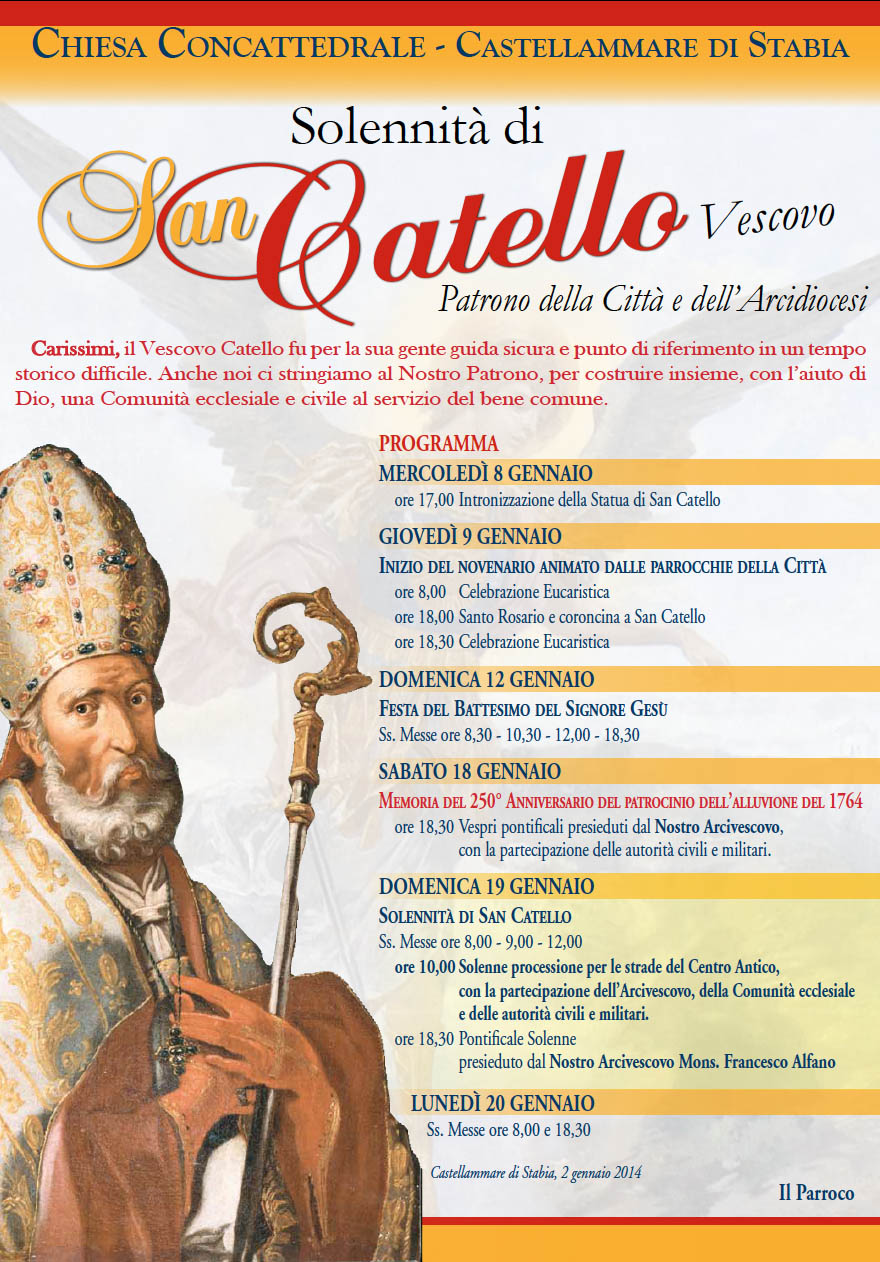 Domenica 19 gennaio, nella solennità di San Catello, oltre alle Messe alle ore 8, 9 e 12, alle ore 10 si terrà la solenne processione per le strade del Centro antico, con la partecipazione dellarcivescovo, della comunità ecclesiale e delle autorità civili e militari.