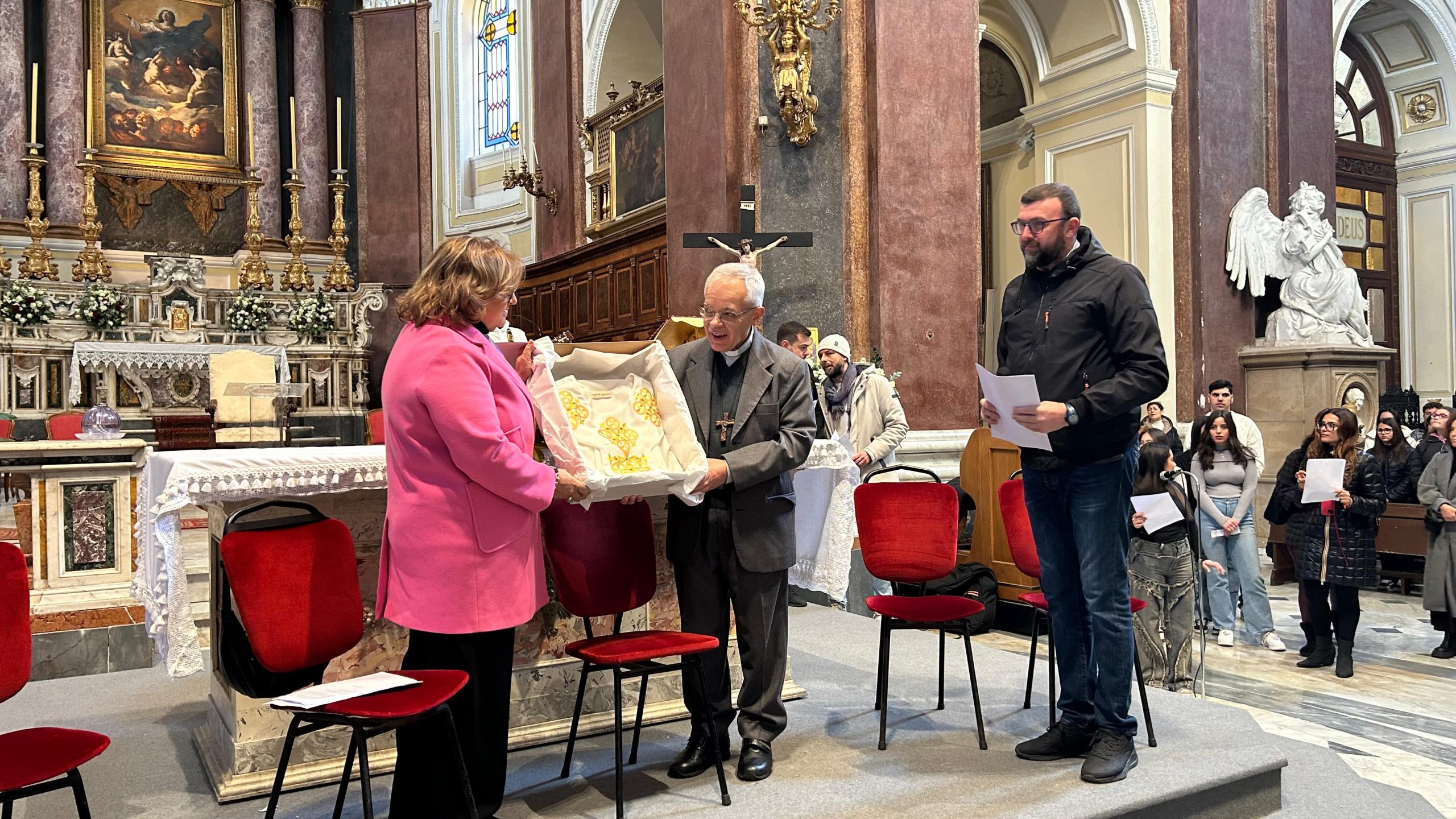 Mons. Francesco Alfano ha incontrato questa mattina, presso la Concattedrale di Castellammare di Stabia, gli studenti dell’Istituto Enzo Ferrari. In occasione della chiusura del Giubileo – prevista domenica 28 dicembre 2025 presso la Concattedrale di Castellammare di Stabia – gli studenti e le studentesse dell’indirizzo “Industria e artigianato per il made in Italy”, hanno donato al Vescovo Alfano una splendida casula. Il progetto grafico, da loro ideato e realizzato, richiama un’antica lastra di marmo proveniente dalla Cattedrale di Sorrento. Un gesto meraviglioso, concordato in sinergia con l’Ufficio Scuola e l’Ufficio Liturgico. Una connessione tra passato e presente, un rimando alle radici della nostra storia locale, che continua a vivere attraverso la creatività e l’attenzione dei giovani.