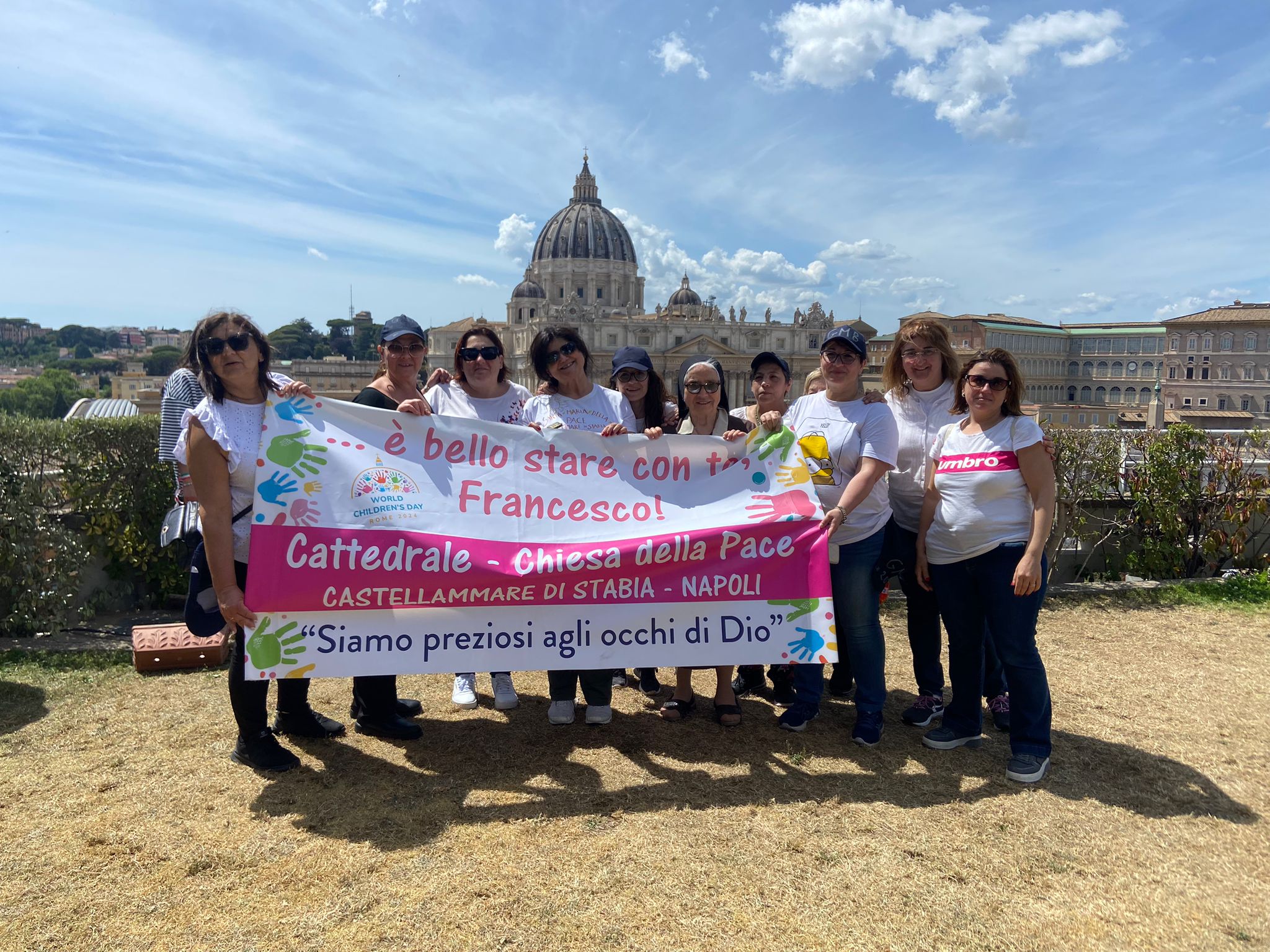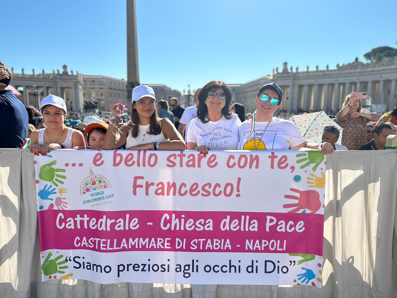 Sono le ore 4,00 di domenica 26 maggio l’alba è ancora lontana ma per le stradine del nostro centro antico,fino alla Cattedrale, si sente un  vociare allegro, quello di una insolita comitiva di bambini,corredati di zainetti,cappellini e bandierine,indossano tutti una maglietta con la sigla colorata,GMB 2024! Nonostante l’ora siamo tutti diretti a Roma,piazza San Pietro ,l’appuntamento è di quelli importanti uno di quelli che si  porta dentro per tutta la vita.  Ci aspetta Papa Francesco, ci  ha convocati proprio lui e il nostro parroco don Antonio De Simone ha fatto si che  la nostra comunità parrocchiale, Cattedrale  e Pace,potesse prontamente rispondere  all’invito. Abbiamo partecipato con un nutrito gruppo di bambini della catechesi e dell’oratorio accompagnati da genitori ,nonni, catechiste ed educatore nonchè dal nostro giovane sacerdote nonchè collaboratore parrocchiale ,don Alessandro Rosanova . Non è stato facile organizzare quest’uscita ma ne è valsa la pena,infatti, sin da subito è stata la gioia a fare da padrona e la voglia di mettersi in viaggio. Noi Cattepax abbiamo voluto fortemente uno striscione che ci rappresentasse, insieme alle magliette e ai cappellini e da confronti vari è nata l’idea di scrivere una frase che portasse il nostro messaggio al papa: ”E’ bello stare con te,Francesco”, che ci identificasse con il nome delle nostre Parrocchie,della nostra città  e che riportasse le parole del messaggio di questa prima GMB trasformandola un po’  in :”Siamo preziosi agli occhi di Dio”