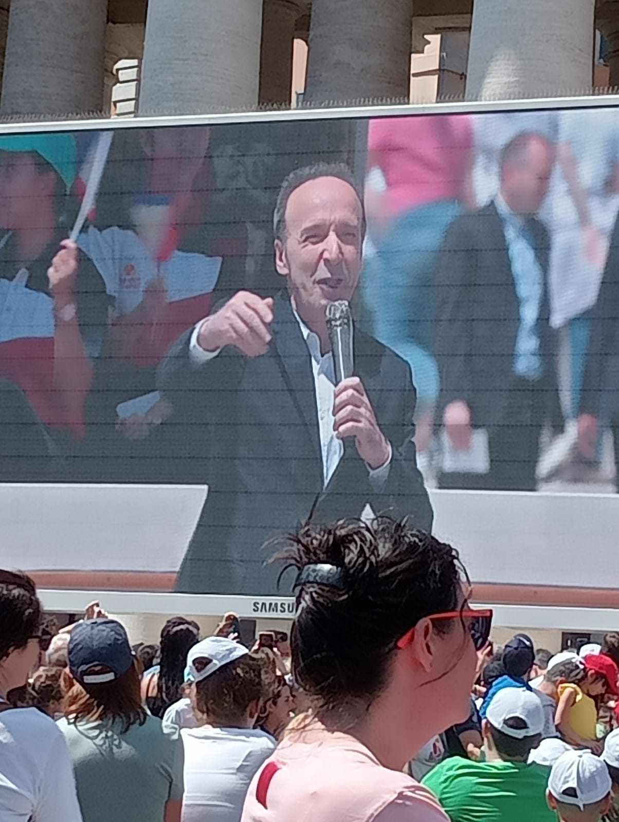 In quella Piazza c’erano occhi e orecchie solo per lui che ha incantato adulti e bambini e le sue belle parole hanno cancellato la stanchezza e il caldo . Finita la Celebrazione Eucaristica,abbiamo pregato l’Angelus ed  ecco che arriva l’ultimo regalo di questa GMB 2024 il monologo dell’attore Roberto Benigni che ha parlato ai bambini come se li avesse tutti seduti lì vicino a lui con le gambe incrociate .Il suo è stato un intervento importante ,detto con parole semplici ma incisive e fra le tante quella che più ha colpito il nostro gruppo e’ stata: