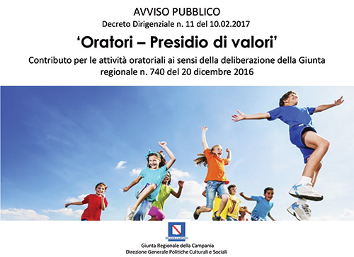 Sul Bollettino Ufficiale della Regione Campania numero 58 del 24/07/2017, sono state pubblicate le graduatorie del pregetto “Oratori presidio di valori” sono diverse le parrocchie della nostra diocesi che hanno presentato il progetto di queste pubblichiamo quelle che hanno visto il loro progetto ammissibile e finanziabile.