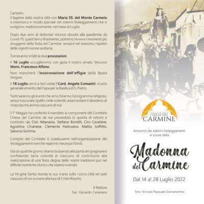 “Il legame della nostra città con la Vergine del Carmelo si estrinseca in modo speciale nei solenni festeggiamenti di quest’anno – ha spiegato il rettore della chiesa don Gerardo Cesarano -. Dopo due anni di dolorose rinunce dovute alla pandemia, quest’anno finalmente, potremo rivivere i momenti più struggenti della festa del Carmine, sempre nel massimo rispetto delle vigenti norme sanitarie. Tanti saranno gli eventi che arricchiranno il programma religioso, senza trascurare quello civile, volendo assecondare il desiderio di rinascita che anima ciascuno di noi”.